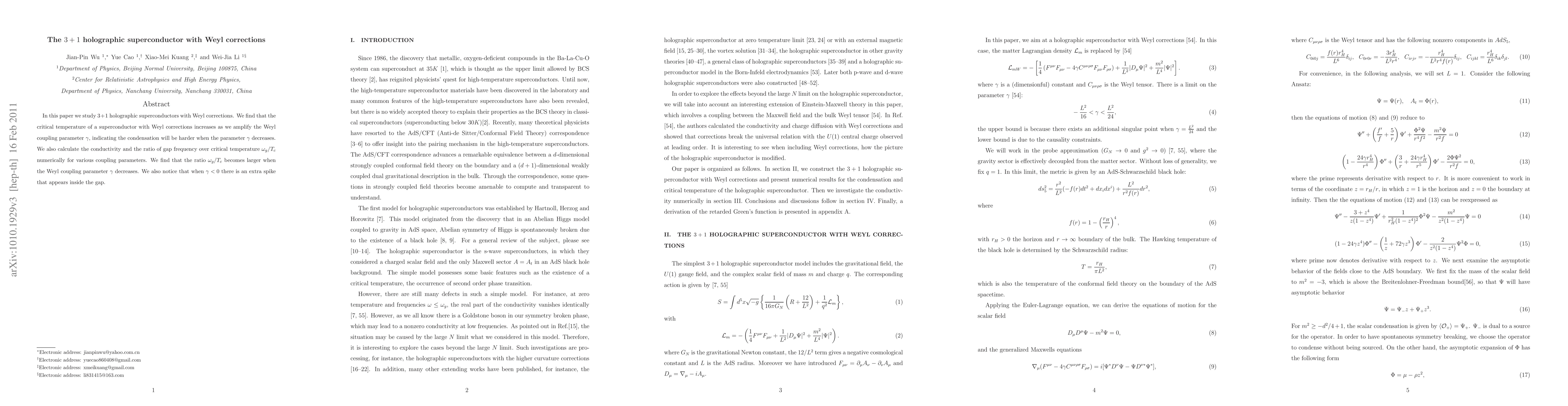 This paper investigates $3+1$ dimensional holographic superconductors with Weyl corrections, revealing that the critical temperature rises with increased Weyl coupling parameter $\gamma$. Numerically, the ratio of gap frequency over critical temperature $\omega_g/T_c$ increases as $\gamma$ decreases, and a spike forms within the gap when $\gamma<0$.
