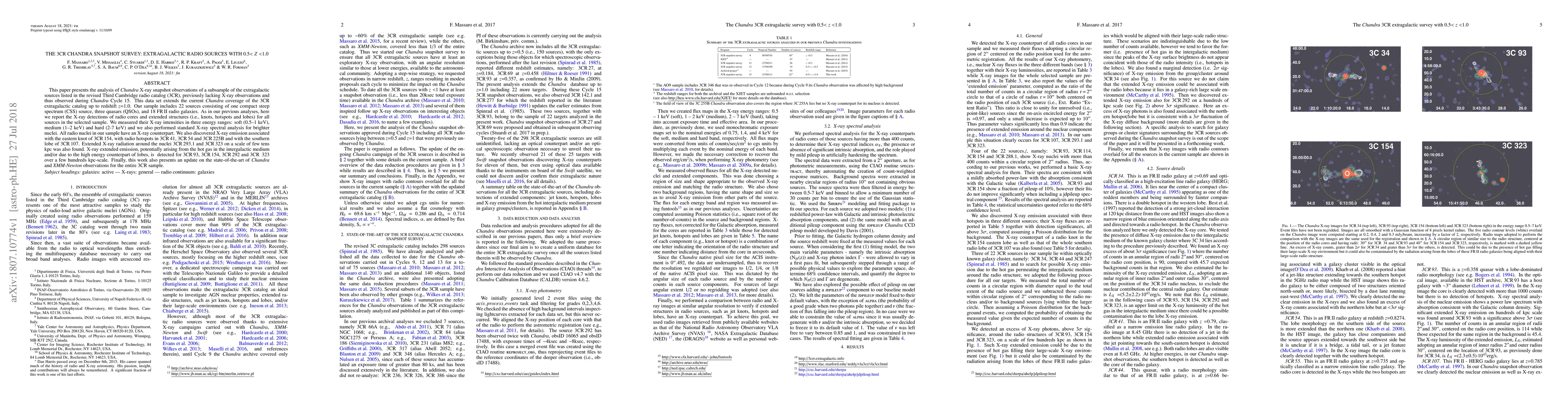 This paper presents the analysis of Chandra X-ray snapshot observations of a subsample of the extragalactic sources listed in the revised Third Cambridge radio catalog (3CR), previously lacking X-ray observations and thus observed during Chandra Cycle 15. This data set extends the current Chandra coverage of the 3CR extragalactic catalog up to redshift $z$=1.0. Our sample includes 22 sources consisting of one compact steep spectrum (CSS) source, three quasars (QSOs), and 18 FR\,II radio galaxies. As in our previous analyses, here we report the X-ray detections of radio cores and extended structures (i.e., knots, hotspots and lobes) for all sources in the selected sample. We measured their X-ray intensities in three energy ranges: soft (0.5--1 keV), medium (1--2 keV) and hard (2-7 keV) and we also performed standard X-ray spectral analysis for brighter nuclei. All radio nuclei in our sample have an X-ray counterpart. We also discovered X-ray emission associated with the eastern knot of 3CR\,154, with radio hotspots in 3CR\,41, 3CR\,54 and 3CR\,225B and with the southern lobe of 3CR\,107. Extended X-ray radiation around the nuclei 3CR\,293.1 and 3CR\,323 on a scale of few tens kpc was also found. X-ray extended emission, potentially arising from the hot gas in the intergalactic medium and/or due to the high energy counterpart of lobes, is detected for 3CR\,93, 3CR\,154, 3CR\,292 and 3CR\, 323 over a few hundreds kpc-scale. Finally, this work also presents an update on the state-of-the-art of Chandra and XMM-Newton observations for the entire 3CR sample.