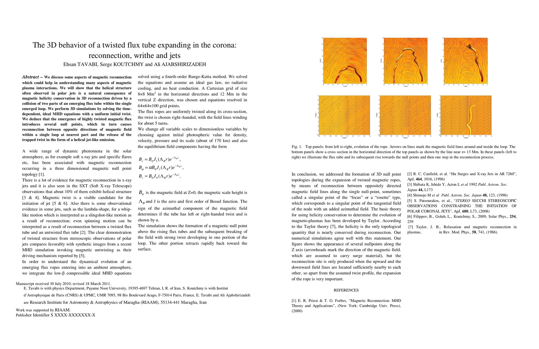 This paper explores the 3D behavior of twisted flux tubes in the solar corona, focusing on magnetic reconnection, writhe, and jet formation. Through 3D simulations solving ideal MHD equations, it demonstrates that helical structures in polar jets arise from magnetic helicity conservation during reconnection, driven by the collision of two parts of an emerging flux tube.