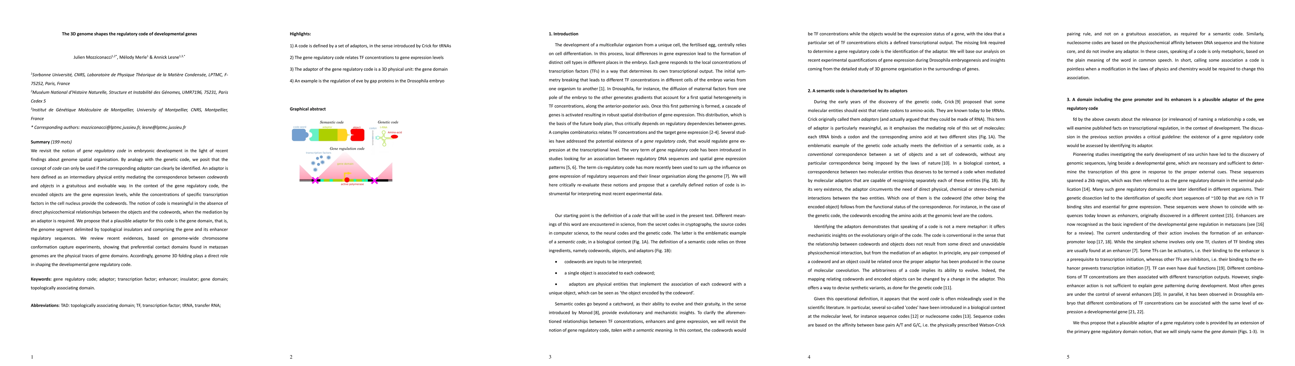 This paper argues that the 3D organization of the genome acts as an adaptor in the gene regulatory code during embryonic development, facilitating correspondence between transcription factor concentrations and gene expression levels. It posits that gene domains, delimited by topological insulators, mediate this relationship, with 3D genome folding influencing developmental gene regulation.