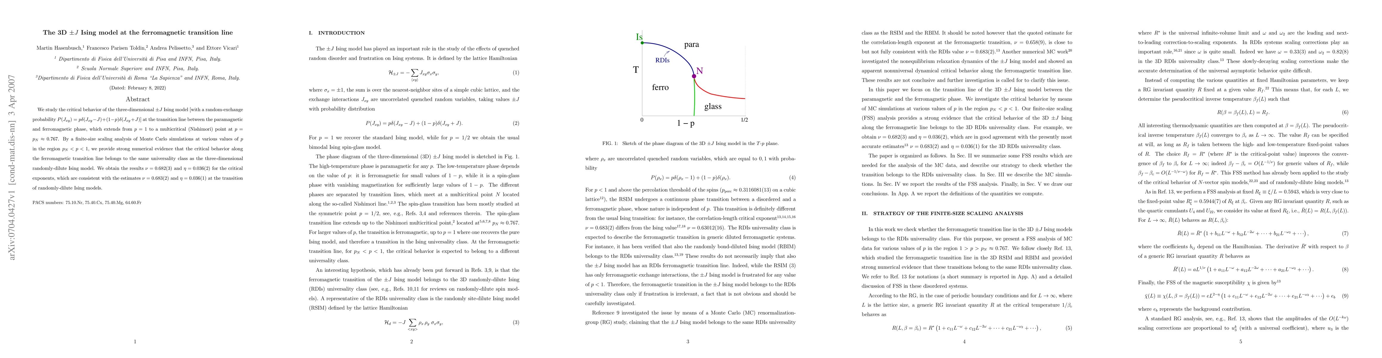 This paper investigates the critical behavior of the 3D ±J Ising model near the ferromagnetic transition line, finding that it shares the same universality class as the randomly-dilute Ising model. The critical exponents obtained from Monte Carlo simulations are $\nu=0.682(3)$ and $\eta=0.036(2)$, consistent with estimates for the randomly-dilute Ising model.