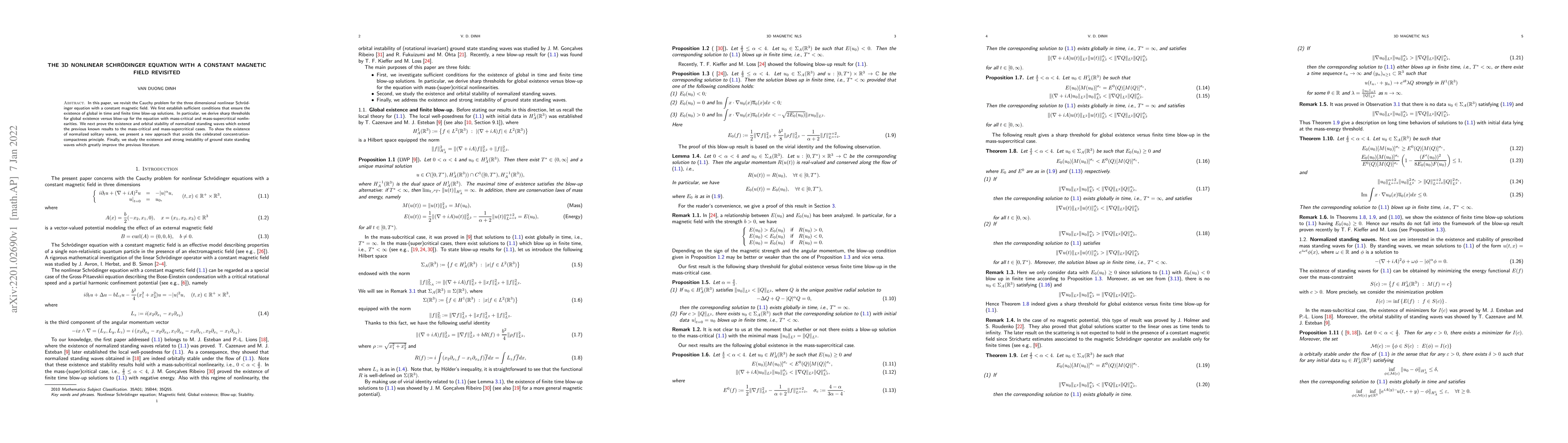 This paper revisits the three-dimensional nonlinear Schrödinger equation under a constant magnetic field, establishing conditions for global existence and finite time blow-up, deriving sharp thresholds for mass-critical and mass-supercritical cases, and proving the existence and orbital stability of normalized standing waves. A new approach is introduced to demonstrate the existence of normalized solitary waves, and the strong instability of ground state standing waves is studied.