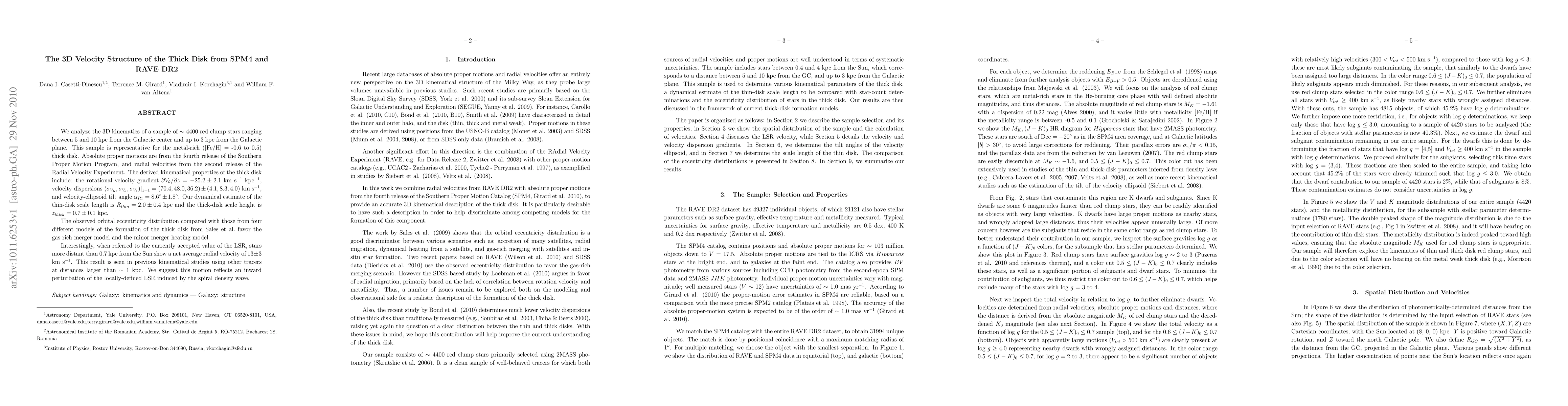 We analyze the 3D kinematics of a sample of $\sim 4400$ red clump stars ranging between 5 and 10 kpc from the Galactic center and up to 3 kpc from the Galactic plane. This sample is representative for the metal-rich ([Fe/H] = -0.6 to 0.5) thick disk. Absolute proper motions are from the fourth release of the Southern Proper Motion Program, and radial velocities from the second release of the Radial Velocity Experiment. The derived kinematical properties of the thick disk include: the rotational velocity gradient $\partial V_{\theta} / \partial z = -25.2 \pm 2.1$ km s$^{-1}$ kpc$^{-1}$, velocity dispersions $(\sigma_{V_R}, \sigma_{V_{\theta}}, \sigma_{V_z})|_{z=1} = (70.4, 48.0, 36.2) \pm(4.1,8.3,4.0)$ km s$^{-1}$, and velocity-ellipsoid tilt angle $\alpha_{Rz} = 8.6\arcdeg \pm 1.8 \arcdeg$. Our dynamical estimate of the thin-disk scale length is $R_{thin} = 2.0 \pm 0.4$ kpc and the thick-disk scale height is $z_{thick} = 0.7 \pm 0.1$ kpc. The observed orbital eccentricity distribution compared with those from four different models of the formation of the thick disk from Sales et al. favor the gas-rich merger model and the minor merger heating model. Interestingly, when referred to the currently accepted value of the LSR, stars more distant than 0.7 kpc from the Sun show a net average radial velocity of $13 \pm3 $ km s$^{-1}$. This result is seen in previous kinematical studiesusing other tracers at distances larger than $\sim 1$ kpc. We suggest this motion reflects an inward perturbation of the locally-defined LSR induced by the spiral density wave.