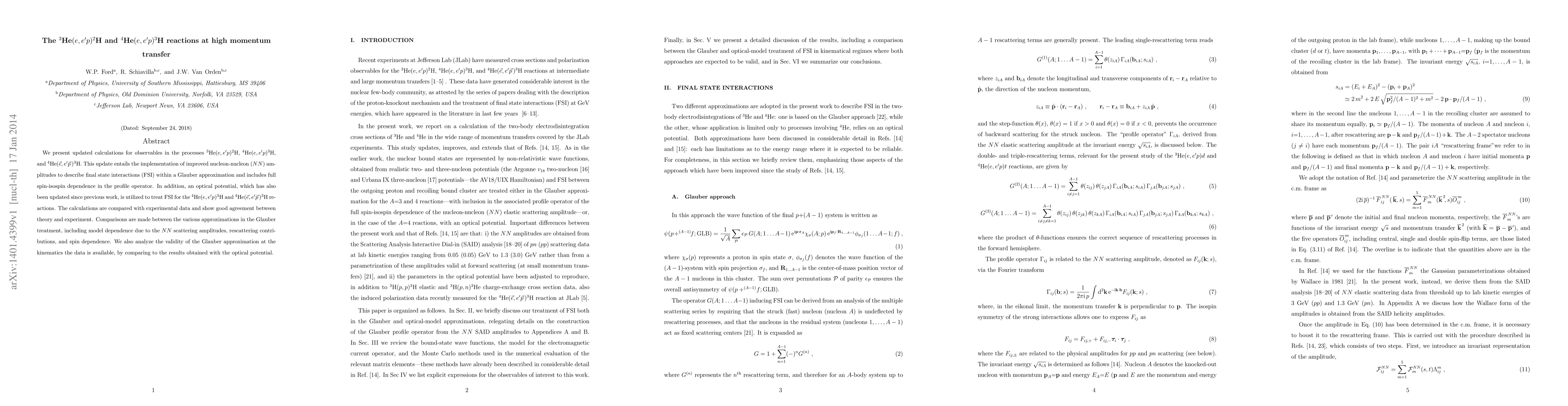This paper updates calculations for high momentum transfer reactions involving $^3$He and $^4$He, incorporating improved nucleon-nucleon amplitudes and an optical potential to describe final state interactions. The results show good agreement with experimental data and analyze the validity of the Glauber approximation.