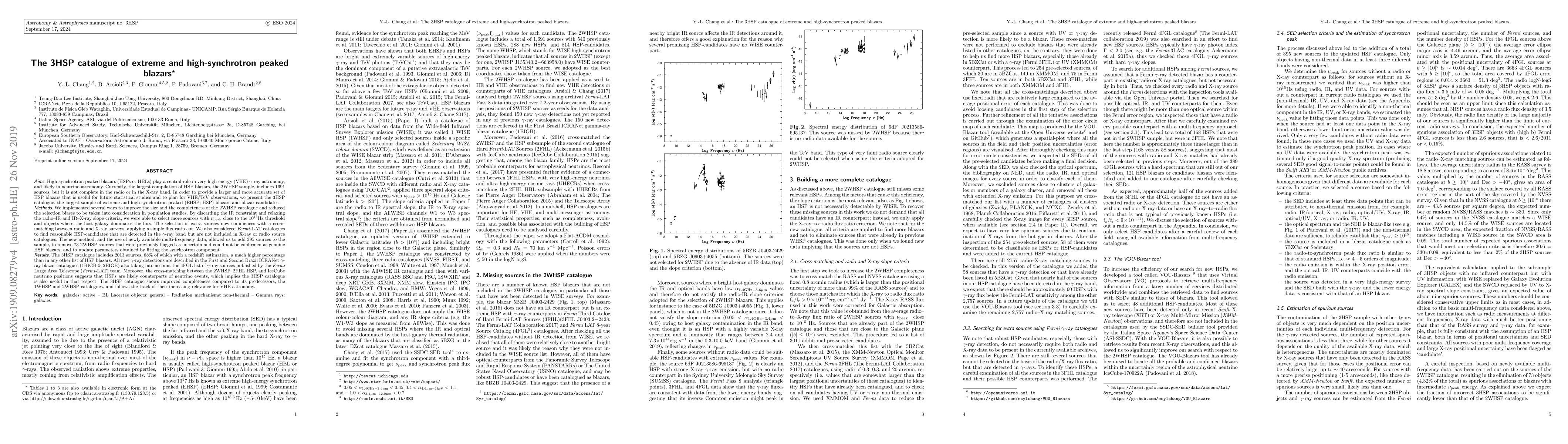 The 3HSP catalogue presents an extensive compilation of extreme and high synchrotron peaked blazars, significantly expanding the previous 2WHSP sample to include 2013 sources with improved completeness and redshift estimations. This enhanced dataset is valuable for future very high energy gamma-ray and neutrino astronomy studies.