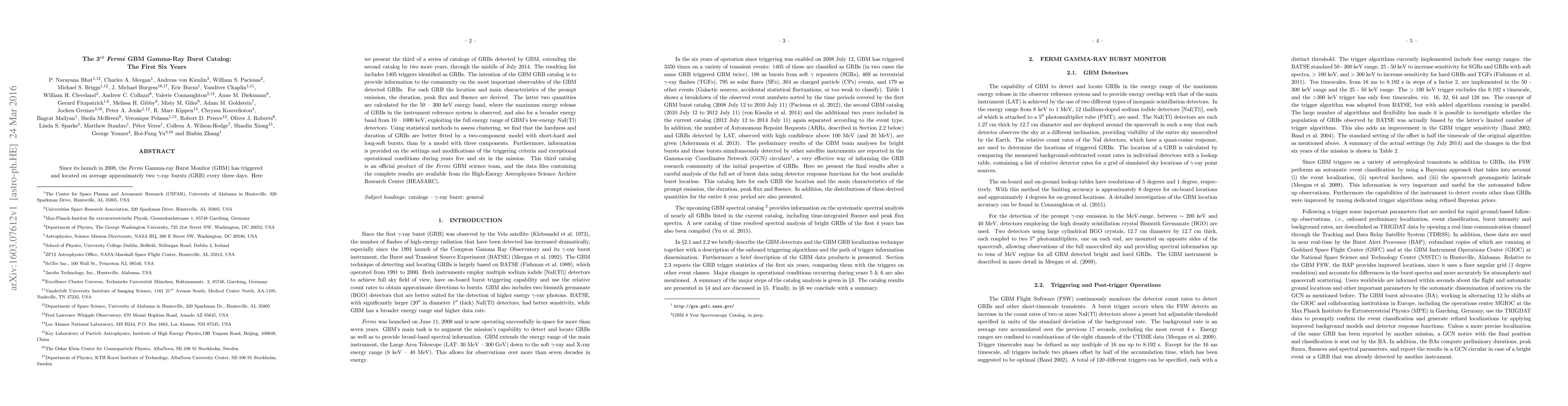 The third Fermi GBM Gamma-Ray Burst Catalog, covering the first six years of the mission, includes 1405 GRB triggers, detailing their locations and characteristics. Statistical analysis favors a two-component model for GRB hardness and duration over a three-component model.