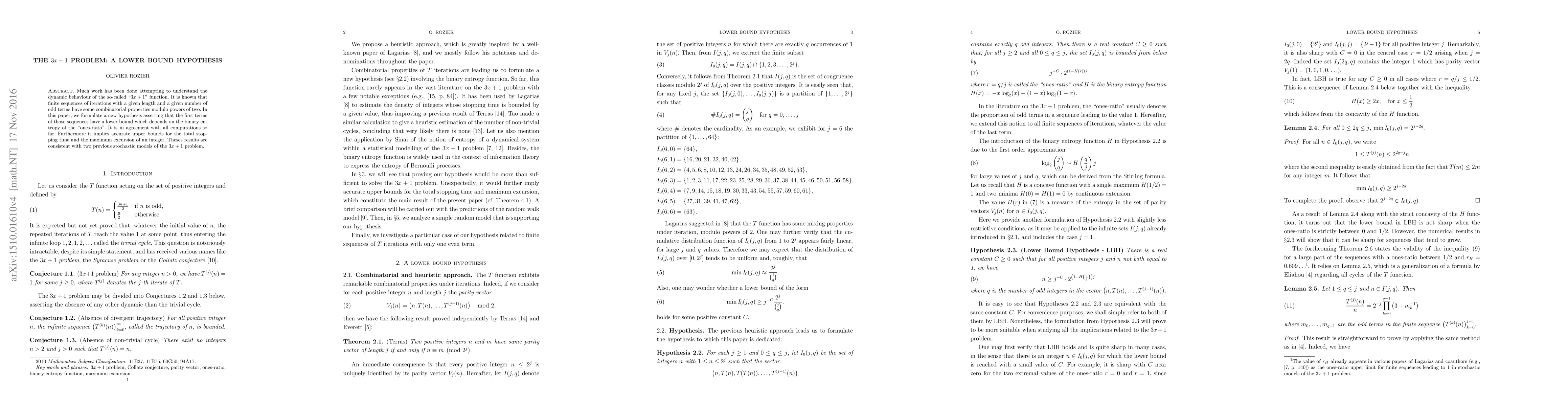 This paper proposes a new hypothesis suggesting a lower bound for the initial terms of sequences generated by the "3x+1" function, based on the binary entropy of the "ones-ratio". The hypothesis aligns with existing computations and implies precise upper bounds for the total stopping time and maximum excursion of integers in the sequence.