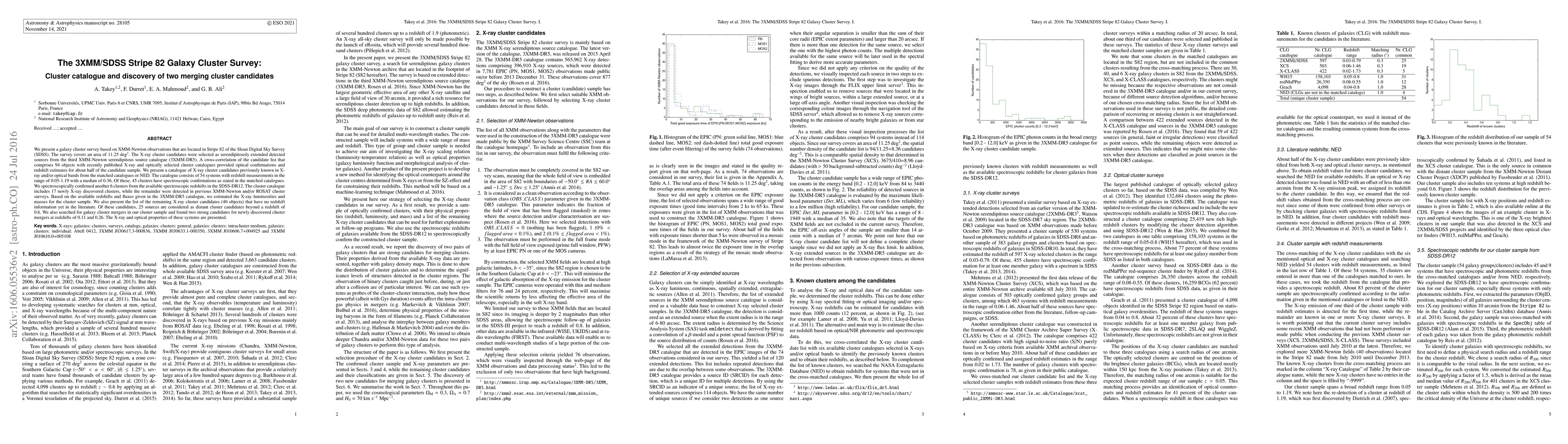 This paper reports on a galaxy cluster survey in Stripe 82 using XMM-Newton observations, resulting in a catalogue of 54 clusters with redshifts ranging from 0.05 to 1.19, including 17 newly discovered clusters. The study also identified two merging cluster candidates, providing insights into their X-ray and optical properties.
