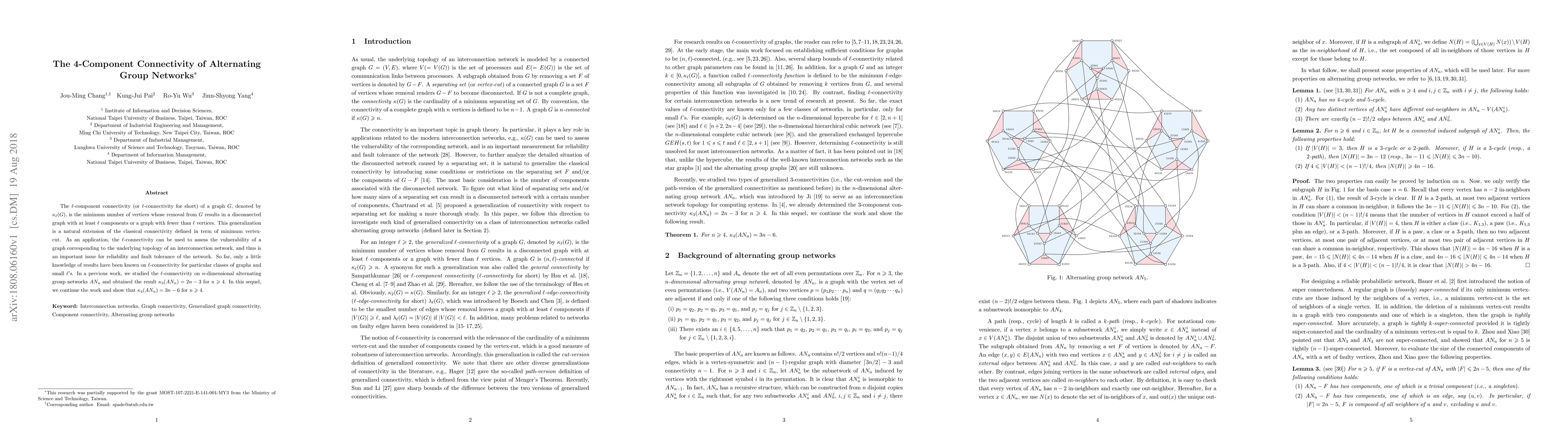 This paper investigates the 4-component connectivity ($\kappa_4$) of $n$-dimensional alternating group networks ($AN_n$), extending previous results on 3-component connectivity. It establishes that $\kappa_4(AN_n) = 3n - 6$ for $n \geq 4$, enhancing understanding of the network's reliability and fault tolerance.