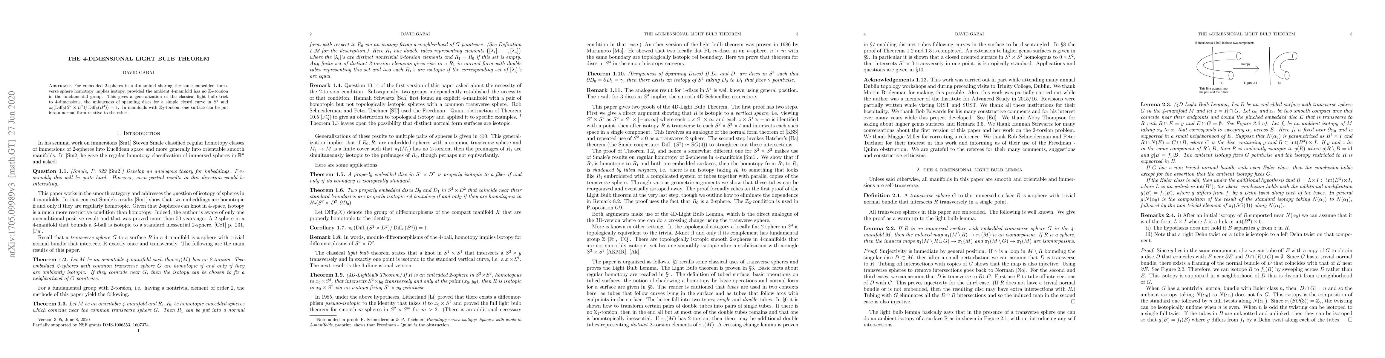 For embedded 2-spheres in a 4-manifold sharing the same embedded transverse sphere homotopy implies isotopy, provided the ambient 4-manifold has no $\BZ_2$-torsion in the fundamental group. This gives a generalization of the classical light bulb trick to 4-dimensions, the uniqueness of spanning discs for a simple closed curve in $S^4$ and $\pi_0(\Diff_0(S^2\times D^2)/\Diff_0(B^4))=1$. In manifolds with $\BZ_2$-torsion, one surface can be put into a normal form relative to the other.