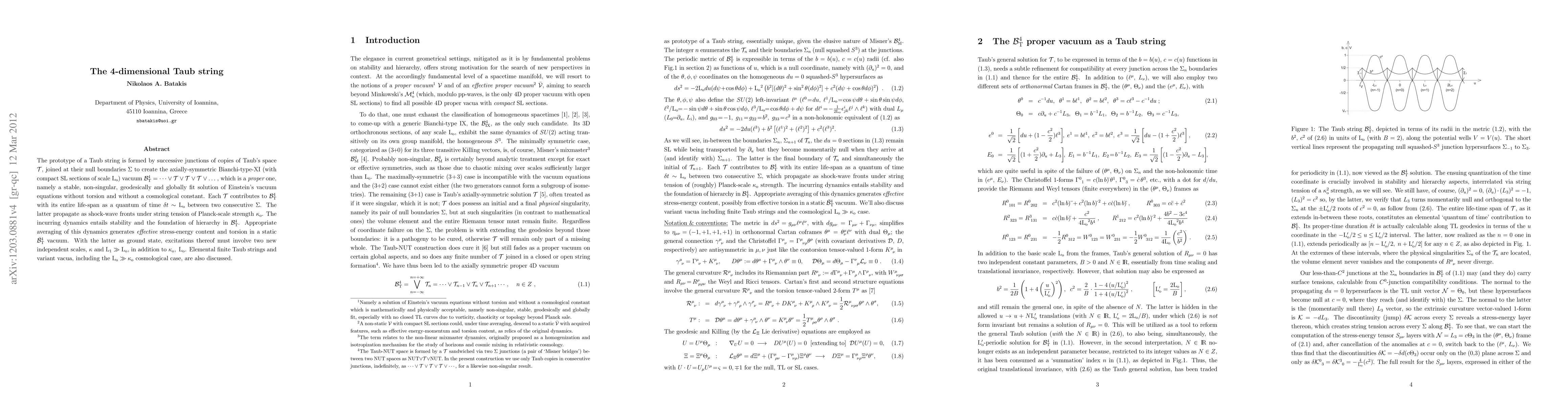 The prototype of a Taub string is formed by successive junctions of copies of Taub's space {\cal T}, joined at their null boundaries \Sigma to create the axially-symmetric Bianchi-type-XI (with compact SL sections of scale {\rm L_o}) vacuum {\cal B}^4_{\rm T}= ...\vee {\cal T}\vee {\cal T}\vee {\cal T}\vee..., which is a {\em proper} one, namely a stable non-singular geodesically complete and globally fit solution of Einstein's vacuum equations without torsion and without a cosmological constant. Each {\cal T} contributes to {\cal B}^4_{\rm T} with its entire life-span as a quantum of time \delta t\sim{\rm L_ o} between two consecutive \Sigma. The latter propagate as shock-wave fronts under string tension of Planck-scale strength \kappa_{\rm o}. The incurring dynamics entails stability and the foundation of hierarchy in {\cal B}^4_{\rm T}. Appropriate averaging of this dynamics generates {\em effective} stress-energy content and torsion in a static \bar{\cal B}^4_{\rm T} vacuum. With the latter as ground state, excitations thereof must involve two new independent scales, \kappa and {\rm L_1}\gg{\rm L_o}, in addition to \kappa_{\rm o}, {\rm L_o}. Elemental finite Taub strings and variant vacua, including the {\rm L_o}\gg\kappa_{\rm o} cosmological case, are also discussed.