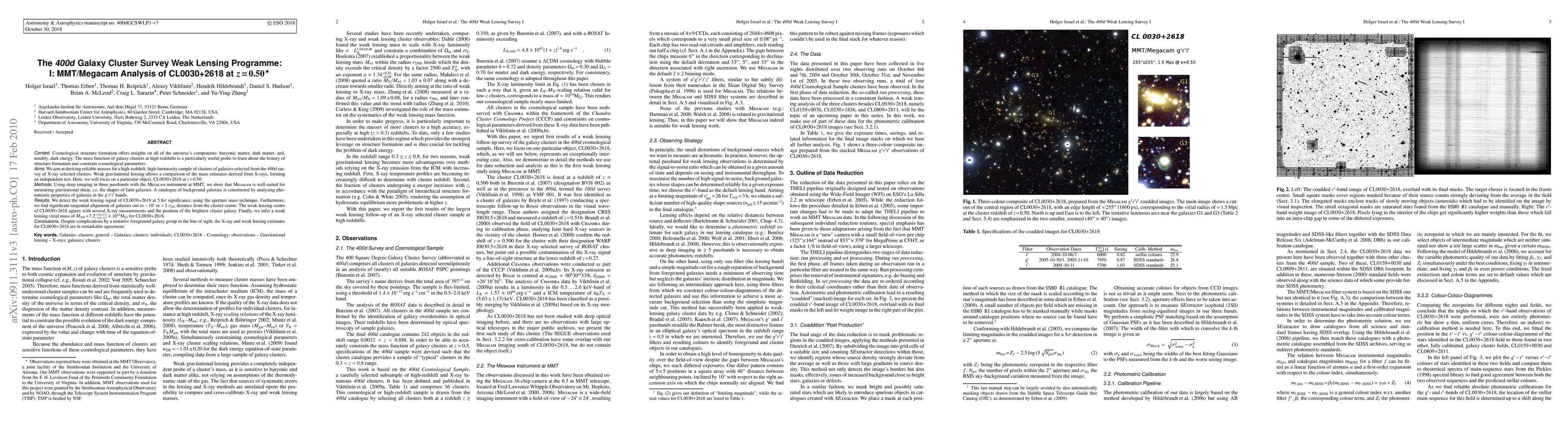 The mass function of galaxy clusters at high redshifts is a particularly useful probe to learn about the history of structure formation and constrain cosmological parameters. We aim at deriving reliable masses for a high-redshift, high-luminosity sample of clusters of galaxies selected from the 400d survey of X-ray selected clusters. Here, we will focus on a particular object, CL0030+2618 at z=0.50 Using deep imaging in three passbands with the MEGACAM instrument at MMT, we show that MEGACAM is well-suited for measuring gravitational shear. We detect the weak lensing signal of CL0030+2618 at 5.8 sigma significance, using the aperture mass technique. Furthermore, we find significant tangential alignment of galaxies out to ~10 arcmin or >2r_200 distance from the cluster centre. The weak lensing centre of CL0030+2618 agrees with several X-ray measurements and the position of the brightest cluster galaxy. Finally, we infer a weak lensing virial mass of M_200=7.5 10^{14} M_sun for CL0030+2618. Despite complications by a tentative foreground galaxy group in the line of sight, the X-ray and weak lensing estimates for CL0030+2618 are in remarkable agreement. This study paves the way for the largest weak lensing survey of high-redshift galaxy clusters to date.
