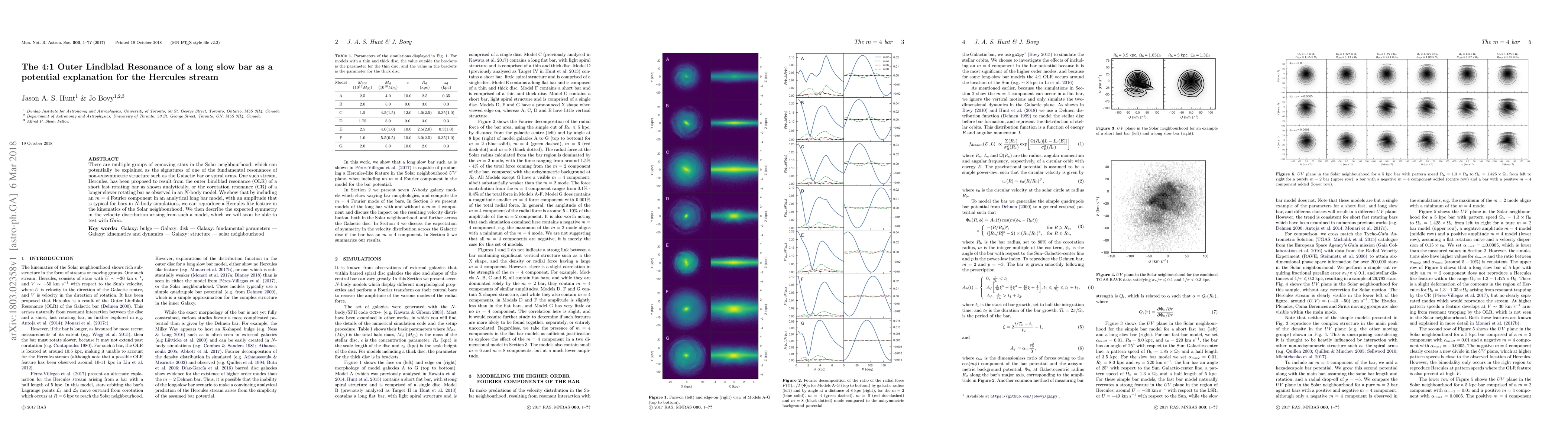 There are multiple groups of comoving stars in the Solar neighbourhood, which can potentially be explained as the signatures of one of the fundamental resonances of non-axisymmetric structure such as the Galactic bar or spiral arms. One such stream, Hercules, has been proposed to result from the outer Lindblad resonance (OLR) of a short fast rotating bar as shown analytically, or the corotation resonance (CR) of a longer slower rotating bar as observed in an N-body model. We show that by including an m = 4 Fourier component in an analytical long bar model, with an amplitude that is typical for bars in N-body simulations, we can reproduce a Hercules like feature in the kinematics of the Solar neighbourhood. We then describe the expected symmetry in the velocity distribution arising from such a model, which we will soon be able to test with Gaia.