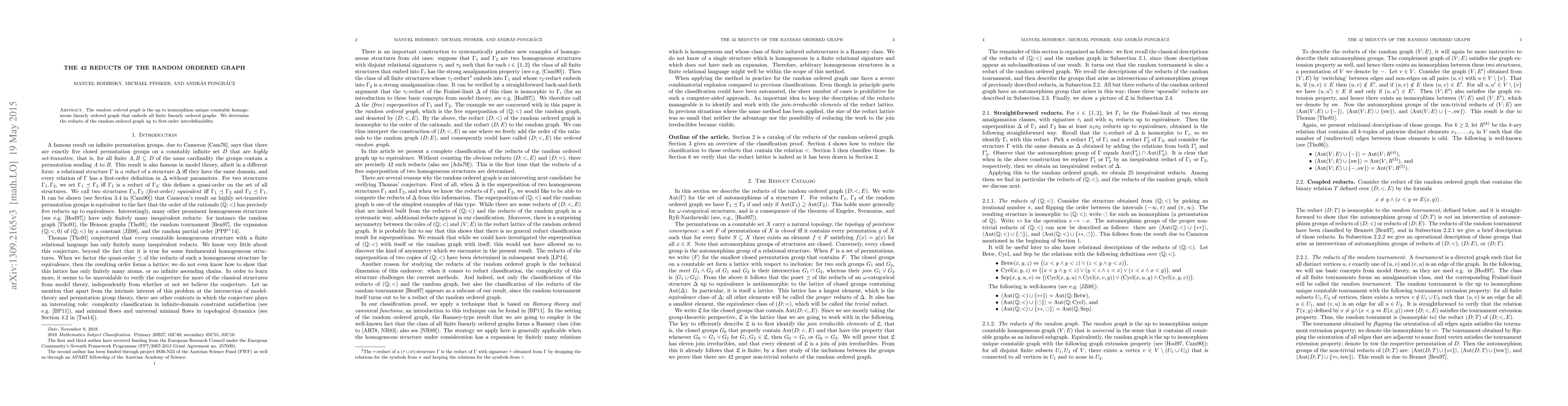 Summary: This paper identifies and categorizes the 42 first-order interdefinable reducts of the unique countable homogeneous linearly ordered graph, known as the random ordered graph, which embeds all finite linearly ordered graphs. The focus is on determining these reducts up to first-order interdefinability.