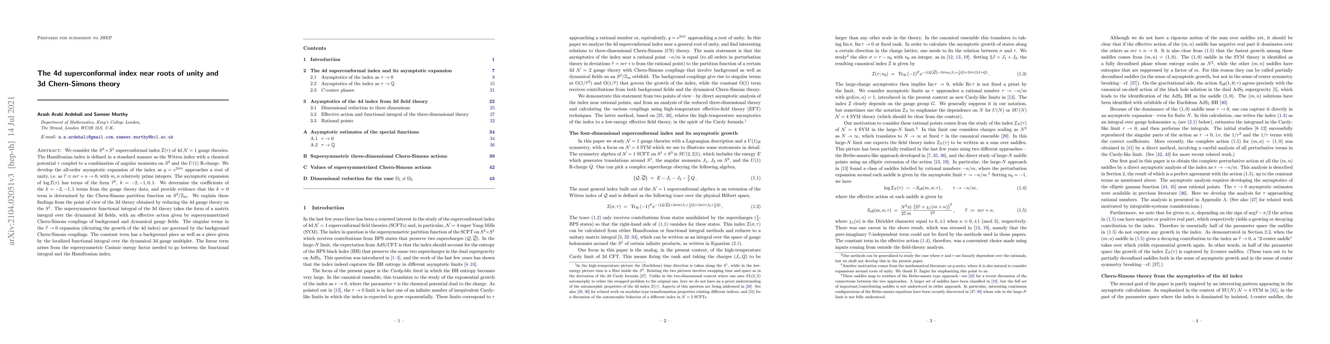 This paper studies the asymptotic behavior of the 4d superconformal index near roots of unity and connects it to the 3d Chern-Simons theory. It finds that the leading singular terms in the index expansion are determined by background Chern-Simons couplings, while the constant term is linked to the localized functional integral over the dynamical 3d gauge multiplet.