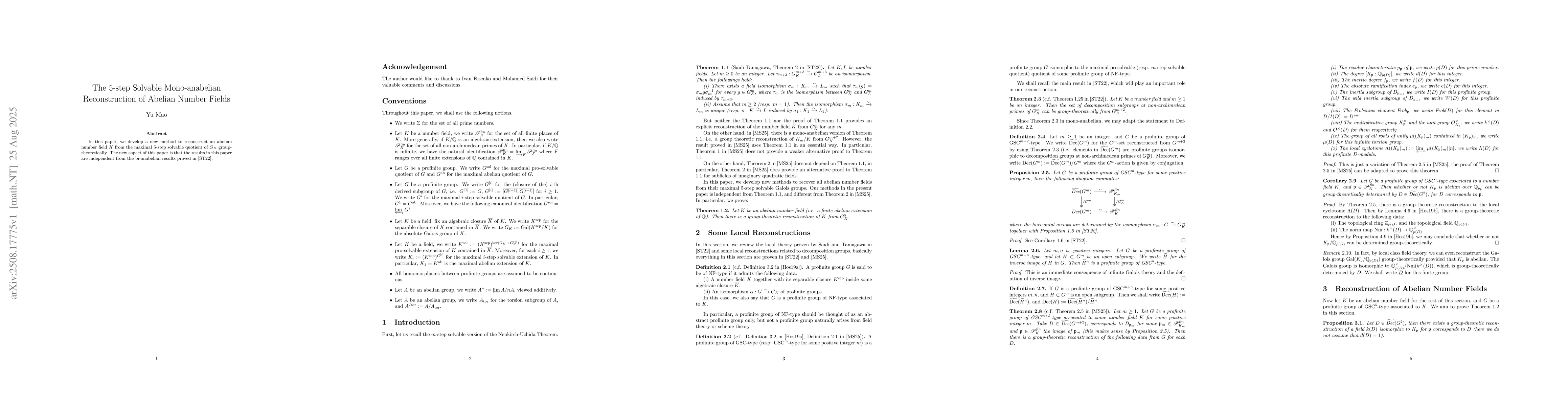 In this paper, we develop a new method to reconstruct an abelian number field $K$ from the maximal $5$-step solvable quotient of $G_K$ group- theoretically. The new aspect of this paper is that the results in this paper are independent from the bi-anabelian results proved proven by Saidi and Tamagawa in [ST22].