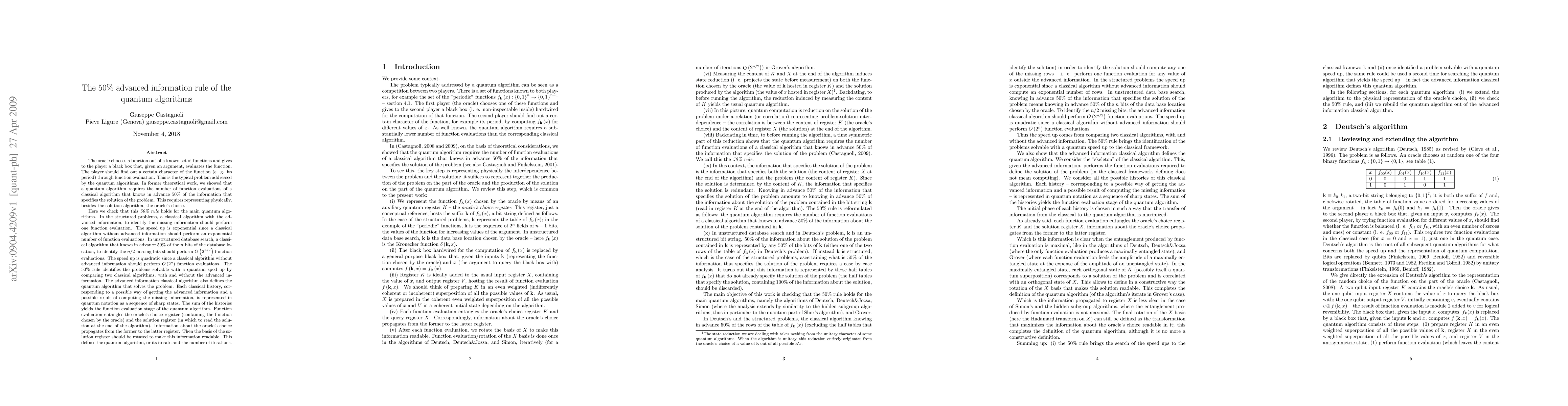 The oracle chooses a function out of a known set of functions and gives to the player a black box that, given an argument, evaluates the function. The player should find out a certain character of the function through function evaluation. This is the typical problem addressed by the quantum algorithms. In former theoretical work, we showed that a quantum algorithm requires the number of function evaluations of a classical algorithm that knows in advance 50% of the information that specifies the solution of the problem. Here we check that this 50% rule holds for the main quantum algorithms. In the structured problems, a classical algorithm with the advanced information, to identify the missing information should perform one function evaluation. The speed up is exponential since a classical algorithm without advanced information should perform an exponential number of function evaluations. In unstructured database search, a classical algorithm that knows in advance 50% of the n bits of the database location, to identify the n/2 missing bits should perform Order(2 power n/2) function evaluations. The speed up is quadratic since a classical algorithm without advanced information should perform Order(2 power n) function evaluations. The 50% rule identifies the problems solvable with a quantum sped up in an entirely classical way, in fact by comparing two classical algorithms, with and without the advanced information.