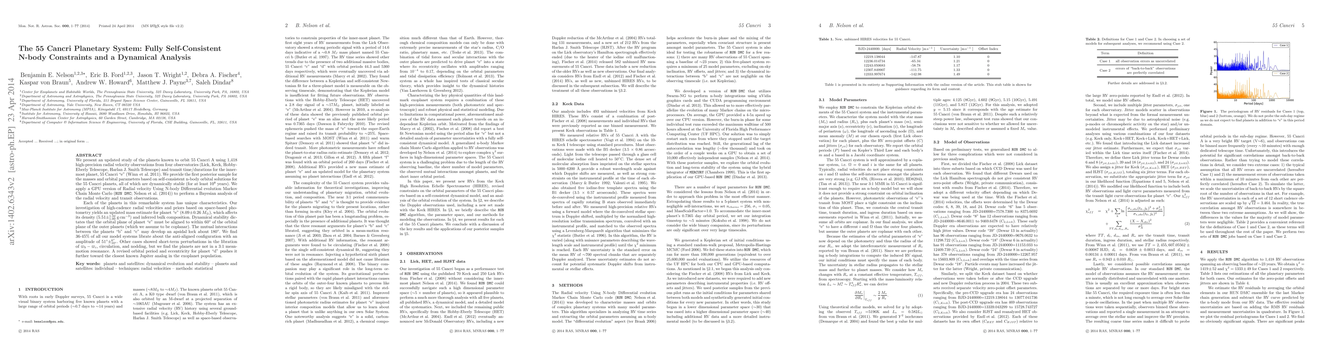 We present an updated study of the planets known to orbit 55 Cancri A using 1,418 high-precision radial velocity observations from four observatories (Lick, Keck, Hobby-Eberly Telescope, Harlan J. Smith Telescope) and transit time/durations for the inner-most planet, 55 Cancri "e" (Winn et al. 2011). We provide the first posterior sample for the masses and orbital parameters based on self-consistent n-body orbital solutions for the 55 Cancri planets, all of which are dynamically stable (for at least $10^8$ years). We apply a GPU version of Radial velocity Using N-body Differential evolution Markov Chain Monte Carlo (RUN DMC; B. Nelson et al. 2014) to perform a Bayesian analysis of the radial velocity and transit observations. Each of the planets in this remarkable system has unique characteristics. Our investigation of high-cadence radial velocities and priors based on space-based photometry yields an updated mass estimate for planet "e" ($8.09\pm0.26$ M$_\oplus$), which affects its density ($5.51\pm^{1.32}_{1.00}$ g cm$^{-3}$) and inferred bulk composition. Dynamical stability dictates that the orbital plane of planet "e" must be aligned to within $60^o$ of the orbital plane of the outer planets (which we assume to be coplanar). The mutual interactions between the planets "b" and "c" may develop an apsidal lock about $180^o$. We find 36-45% of all our model systems librate about the anti-aligned configuration with an amplitude of $51^o\pm^{6^o}_{10^o}$. Other cases showed short-term perturbations in the libration of $\varpi_b-\varpi_c$, circulation, and nodding, but we find the planets are not in a 3:1 mean-motion resonance. A revised orbital period and eccentricity for planet "d" pushes it further toward the closest known Jupiter analog in the exoplanet population.