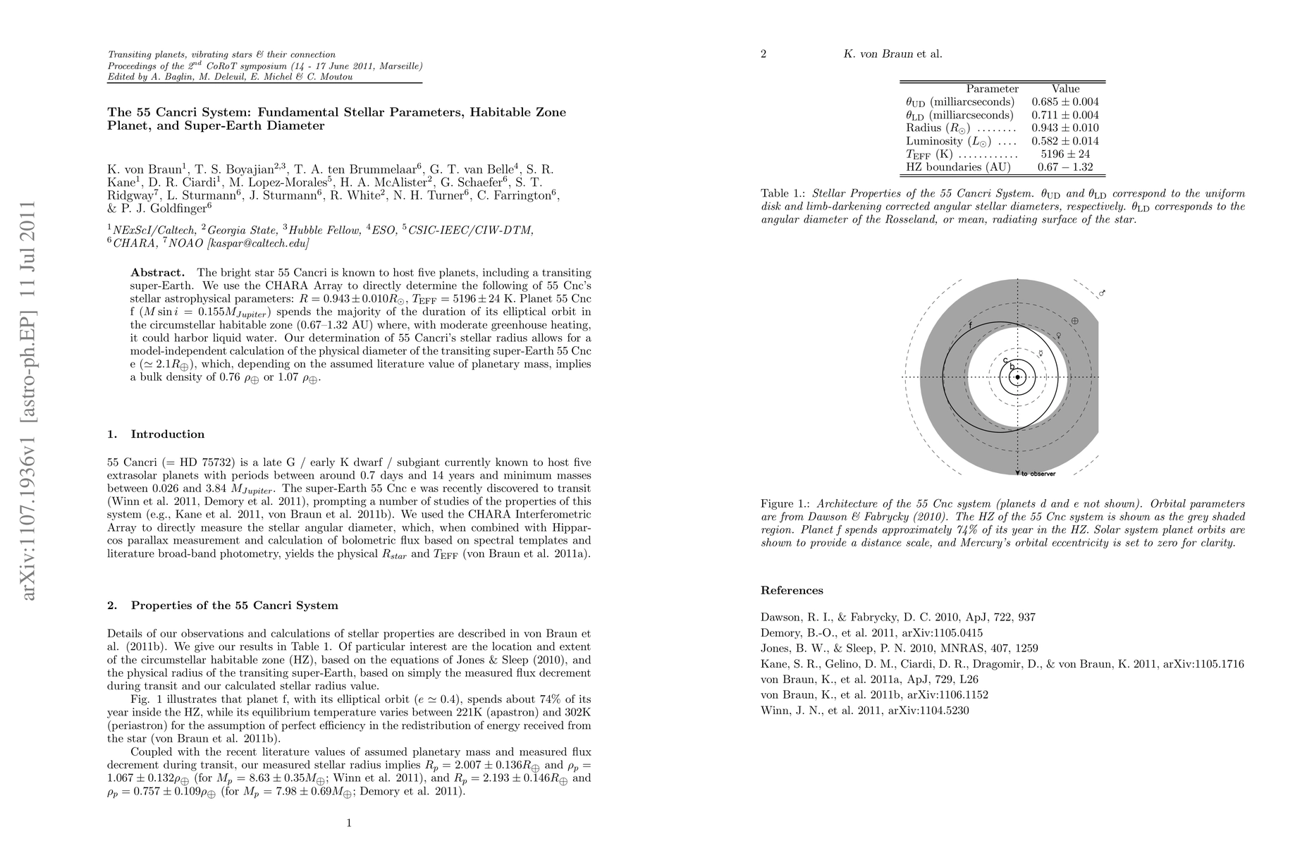The 55 Cancri star system hosts five planets, with a transiting super-Earth, and its stellar parameters have been precisely measured. The super-Earth 55 Cnc e, with a diameter of approximately 2.1 Earth radii, resides in the habitable zone, potentially supporting liquid water.