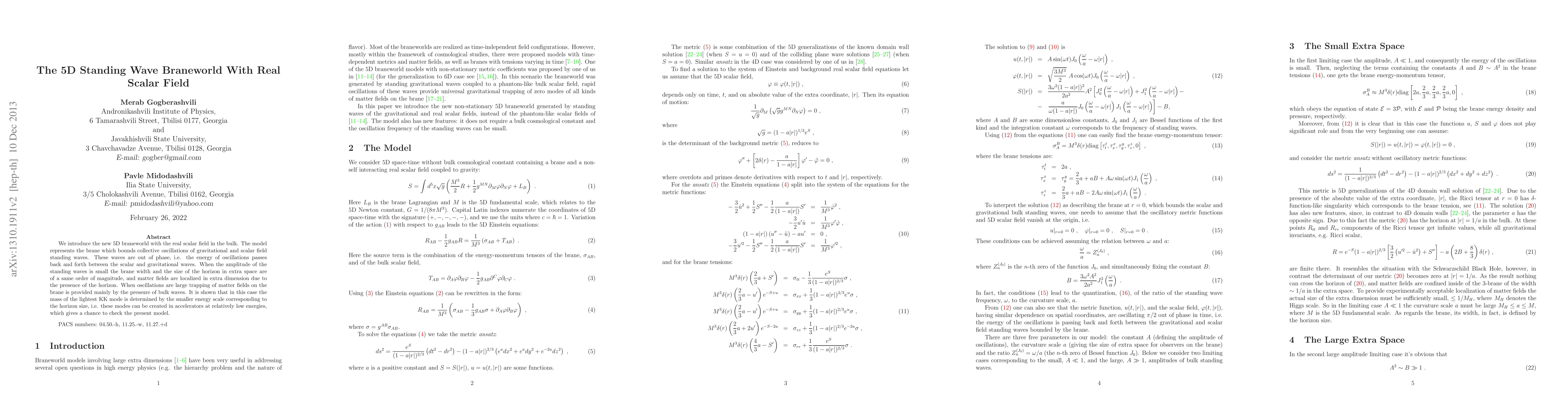 We introduce the new 5D braneworld with the real scalar field in the bulk. The model represents the brane which bounds collective oscillations of gravitational and scalar field standing waves. These waves are out of phase, i.e. the energy of oscillations passes back and forth between the scalar and gravitational waves. When the amplitude of the standing waves is small the brane width and the size of the horizon in extra space are of a same order of magnitude, and matter fields are localized in extra dimension due to the presence of the horizon. When oscillations are large trapping of matter fields on the brane is provided mainly by the pressure of bulk waves. It is shown that in this case the mass of the lightest KK mode is determined by the smaller energy scale corresponding to the horizon size, i.e. these modes can be created in accelerators at relatively low energies, which gives a chance to check the present model.