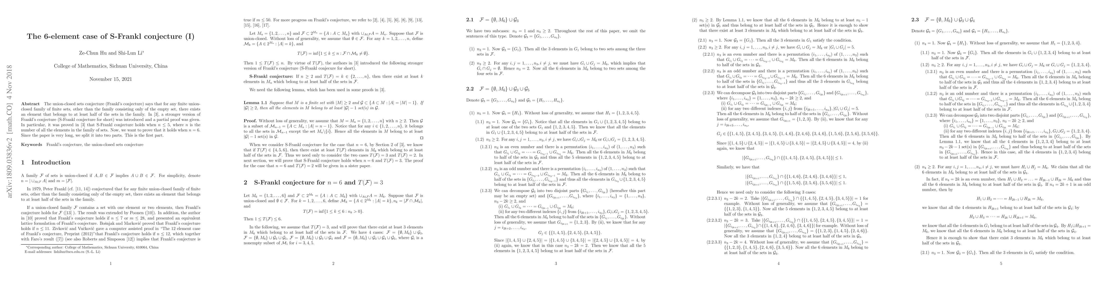The union-closed sets conjecture (Frankl's conjecture) says that for any finite union-closed family of finite sets, other than the family consisting only of the empty set, there exists an element that belongs to at least half of the sets in the family. In [3], a stronger version of Frankl's conjecture (S-Frankl conjecture for short) was introduced and a partial proof was given. In particular, it was proved in \cite{CH17} that S-Frankl conjecture holds when $n\leq 5$, where $n$ is the number of all the elements in the family of sets. Now, we want to prove that it holds when $n=6$. Since the paper is very long, we split it into two parts. This is the first part.