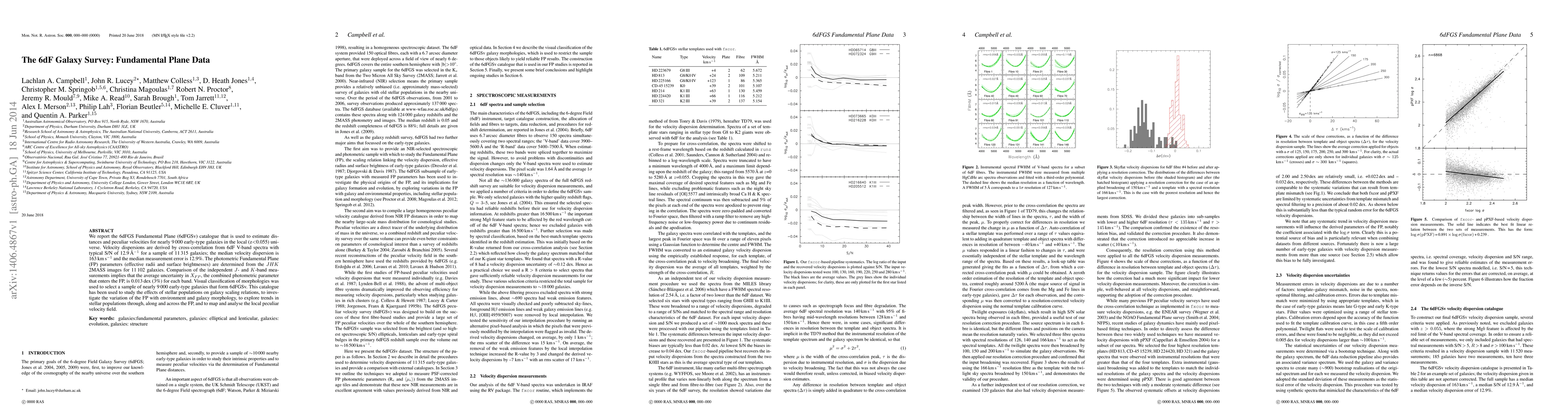 The 6dF Galaxy Survey: Fundamental Plane Data presents a catalogue of 9,000 early-type galaxies' distances and peculiar velocities, derived from 6dFGSv with velocity dispersions from 11,315 V-band spectra and 2MASS JHK images for photometric parameters. The catalogue aids in studying scaling relations, environmental and morphological FP variations, stellar population trends, and local peculiar velocity field mapping.