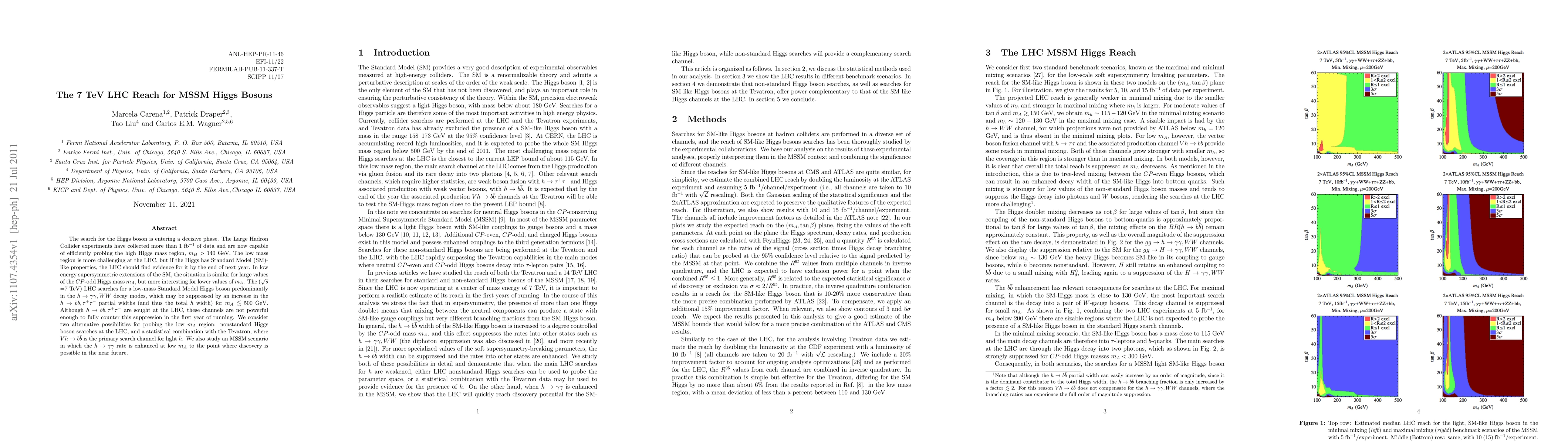 The search for the Higgs boson is entering a decisive phase. The Large Hadron Collider experiments have collected more than 1 fb$^{-1}$ of data and are now capable of efficiently probing the high Higgs mass region, $m_H > 140$ GeV. The low mass region is more challenging at the LHC, but if the Higgs has Standard Model (SM)-like properties, the LHC should find evidence for it by the end of next year. In low energy supersymmetric extensions of the SM, the situation is similar for large values of the CP-odd Higgs mass $m_A$, but more interesting for lower values of $m_A$. The ($\sqrt{s}$ =7 TeV) LHC searches for a low-mass Standard Model Higgs boson predominantly in the $h\rightarrow \gamma\gamma,WW$ decay modes, which may be suppressed by an increase in the $h\rightarrow b\bar{b}, \tau^+ \tau^-$ partial widths (and thus the total $h$ width) for $m_A\lesssim 500$ GeV. Although $h\rightarrow b\bar{b}, \tau^+ \tau^-$ are sought at the LHC, these channels are not powerful enough to fully counter this suppression in the first year of running. We consider two alternative possibilities for probing the low $m_A$ region: nonstandard Higgs boson searches at the LHC, and a statistical combination with the Tevatron, where $Vh\rightarrow b\bar{b}$ is the primary search channel for light $h$. We also study an MSSM scenario in which the $h\rightarrow\gamma\gamma$ rate is enhanced at low $m_A$ to the point where discovery is possible in the near future.