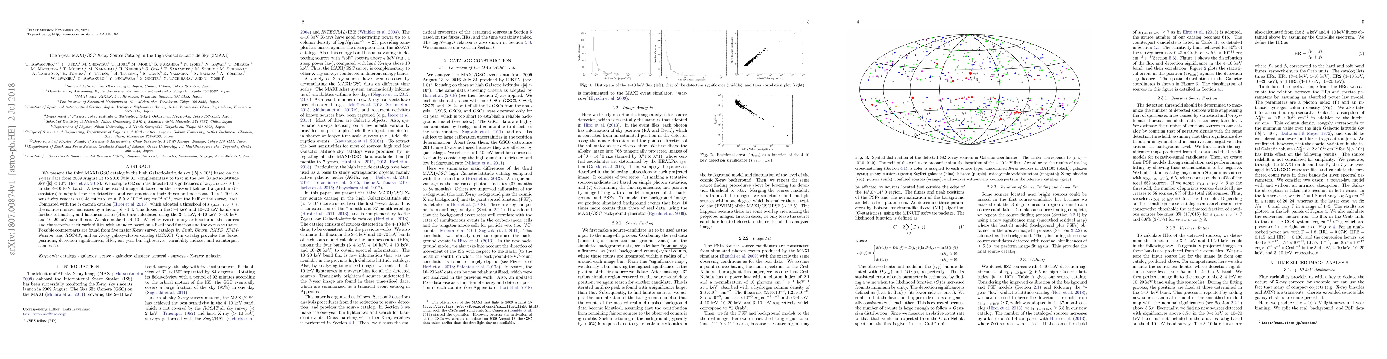 We present the third MAXI/GSC catalog in the high Galactic-latitude sky ($|b| > 10^\circ$) based on the 7-year data from 2009 August 13 to 2016 July 31, complementary to that in the low Galactic-latitude sky ($|b| < 10^\circ$; Hori et al. 2018). We compile 682 sources detected at significances of $s_{\rm D,4-10~keV} \geq 6.5$ in the 4--10 keV band. A two-dimensional image fit based on the Poisson likelihood algorithm ($C$-statistics) is adopted for the detections and constraints on their fluxes and positions. The 4--10 keV sensitivity reaches $\approx 0.48$ mCrab, or $\approx 5.9 \times 10^{-12}$ erg cm$^{-2}$ s$^{-1}$, over the half of the survey area. Compared with the 37-month catalog (Hiroi et al. 2013), which adopted a threshold of $s_{\rm D,4-10~keV} \geq 7$, the source number increases by a factor of $\sim$1.4. The fluxes in the 3--4 keV and 10--20 keV bands are further estimated, and hardness ratios (HRs) are calculated using the 3--4 keV, 4--10 keV, 3--10 keV, and 10--20 keV band fluxes. We also make the 4--10 keV lightcurves in one year bins for all the sources and characterize their variabilities with an index based on a likelihood function and the excess variance. Possible counterparts are found from five major X-ray survey catalogs by Swift, Uhuru, RXTE, XMM-Newton, and ROSAT, and an X-ray galaxy-cluster catalog (MCXC). Our catalog provides the fluxes, positions, detection significances, HRs, one-year bin lightcurves, variability indices, and counterpart candidates.
