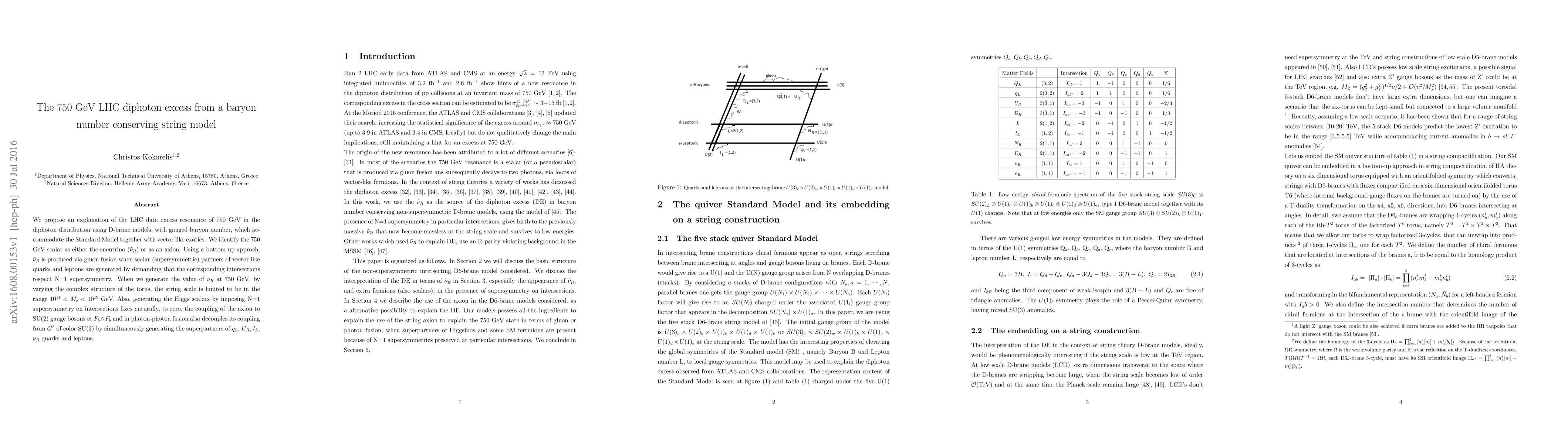 This paper proposes a D-brane model with gauged baryon number to explain the 750 GeV diphoton excess observed at the LHC, identifying the excess as either a right-handed sneutrino or an axion. The model respects N=1 supersymmetry and constrains the string scale to $10^{14} < M_s < 10^{19}$ GeV.