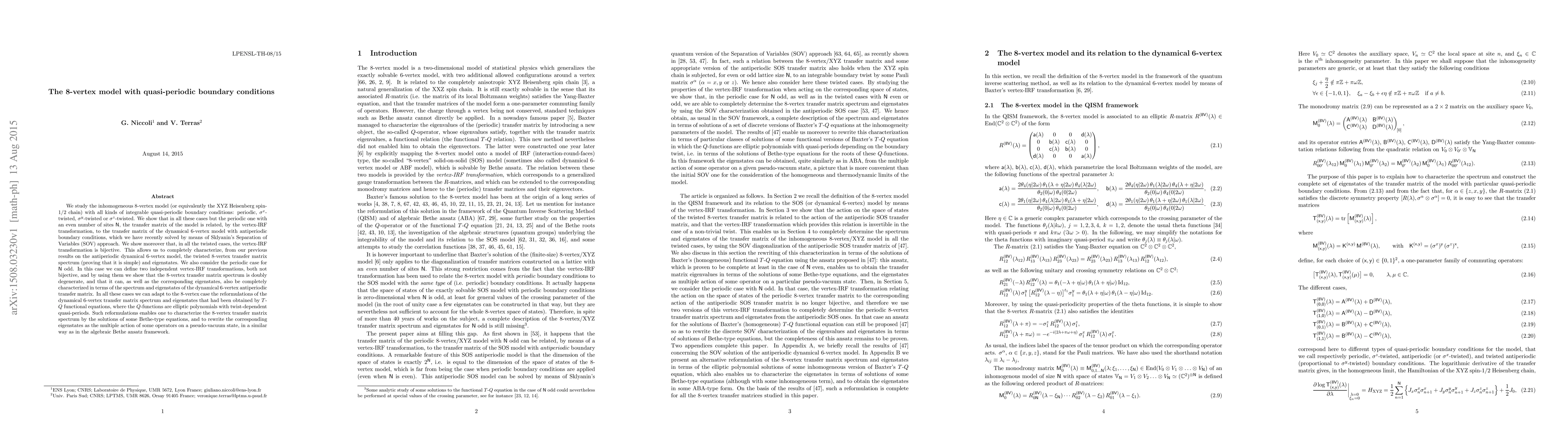 The 8-vertex model with quasi-periodic boundary conditions shows that its transfer matrix is related to the transfer matrix of a solved dynamical 6-vertex model in most cases, allowing for characterization of eigenstates and spectra through connections between vertex models.