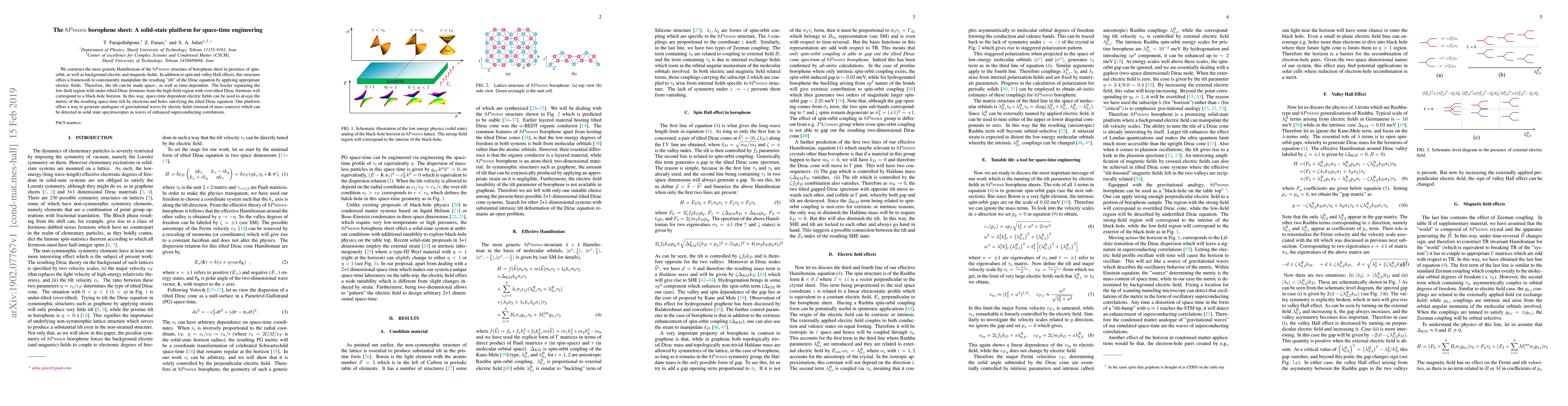 We construct the most generic Hamiltonian of the $8Pmmn$ structure of borophene sheet in presence of spin-orbit, as well as background electric and magnetic fields. In addition to spin and valley Hall effects, this structure offers a framework to conveniently manipulate the resulting "tilt" of the Dirac equation by applying appropriate electric fields. Therefore, the tilt can be made space-, as well as time-dependent. The border separating the low-field region with under-tilted Dirac fermions from the high-field region with over-tilted Dirac fermions will correspond to a black-hole horizon. In this way, space-time dependent electric fields can be used to design the metric of the resulting space-time felt by electrons and holes satisfying the tilted Dirac equation. Our platform offers a way to generate analogues of gravitational waves by electric fields (instead of mass sources) which can be detected in solid state spectroscopies as waves of enhanced superconducting correlations.