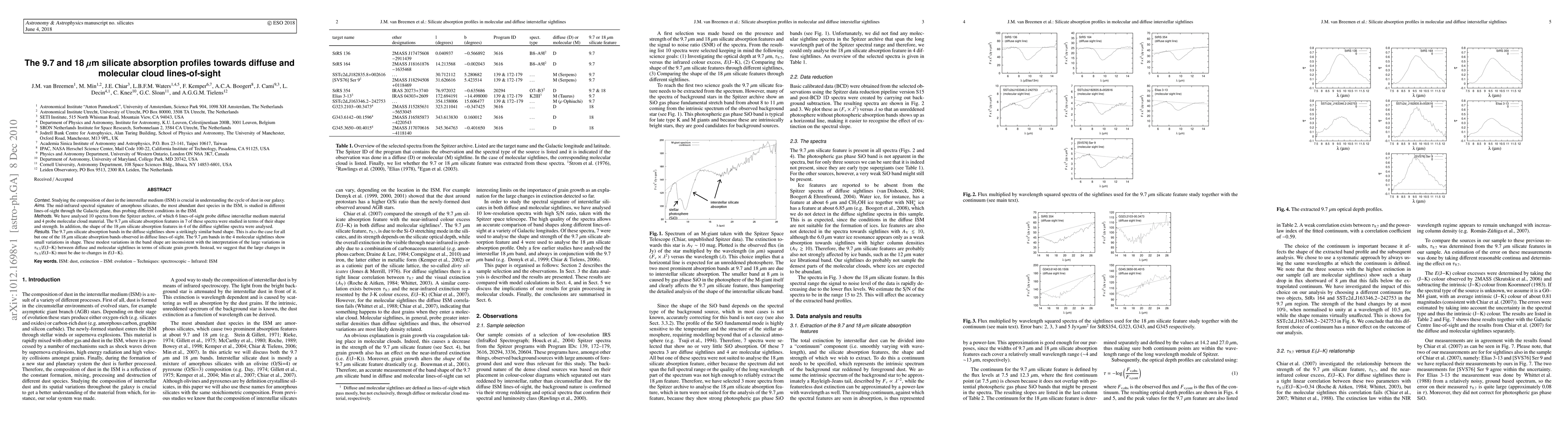 Studying the composition of dust in the interstellar medium (ISM) is crucial in understanding the cycle of dust in our galaxy. The mid-infrared spectral signature of amorphous silicates, the most abundant dust species in the ISM, is studied in different lines-of-sight through the Galactic plane, thus probing different conditions in the ISM. We have analysed 10 spectra from the Spitzer archive, of which 6 lines-of-sight probe diffuse interstellar medium material and 4 probe molecular cloud material. The 9.7 um silicate absorption features in 7 of these spectra were studied in terms of their shape and strength. In addition, the shape of the 18 um silicate absorption features in 4 of the diffuse sightline spectra were analysed. The 9.7 um silicate absorption bands in the diffuse sightlines show a strikingly similar band shape. This is also the case for all but one of the 18 um silicate absorption bands observed in diffuse lines-of-sight. The 9.7 um bands in the 4 molecular sightlines show small variations in shape. These modest variations in the band shape are inconsistent with the interpretation of the large variations in {\tau}_9.7/E(J-K) between diffuse and molecular sightlines in terms of silicate grain growth. Instead, we suggest that the large changes in {\tau}_9.7 / E(J-K) must be due to changes in E(J-K).