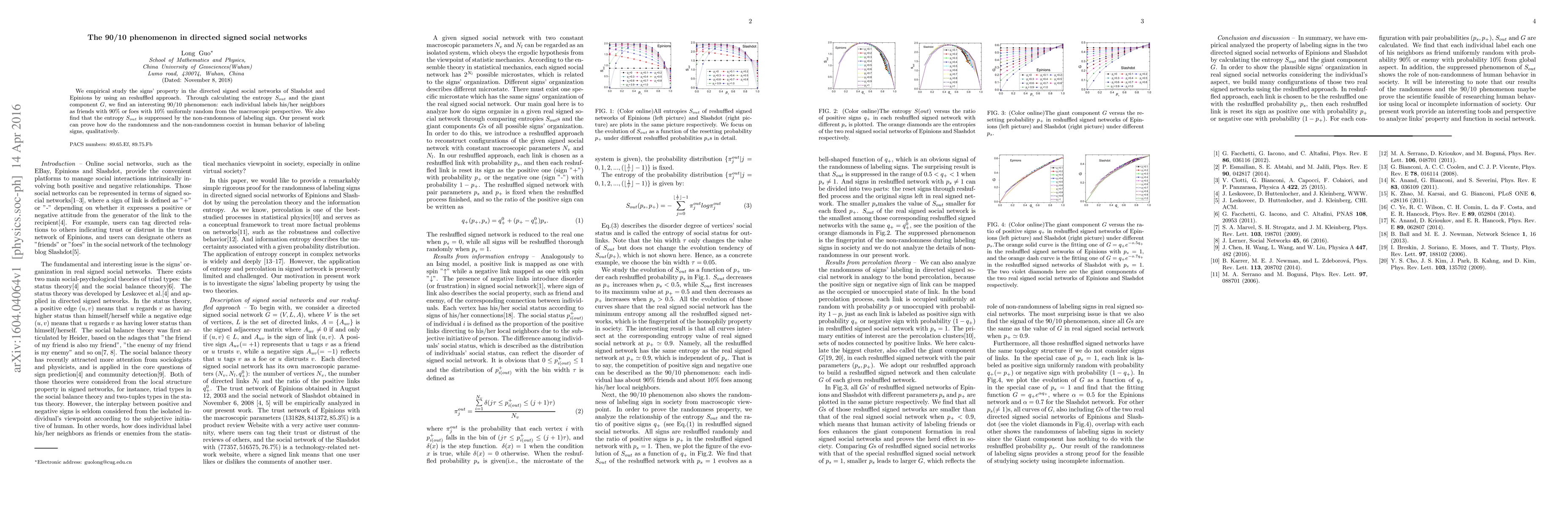 This study investigates the sign properties in directed signed social networks of Slashdot and Epinions, revealing a 90/10 phenomenon where individuals label 90% of their neighbors as friends and 10% as foes. The research also finds that entropy is reduced due to non-random labeling, demonstrating the coexistence of randomness and non-randomness in human social behavior.