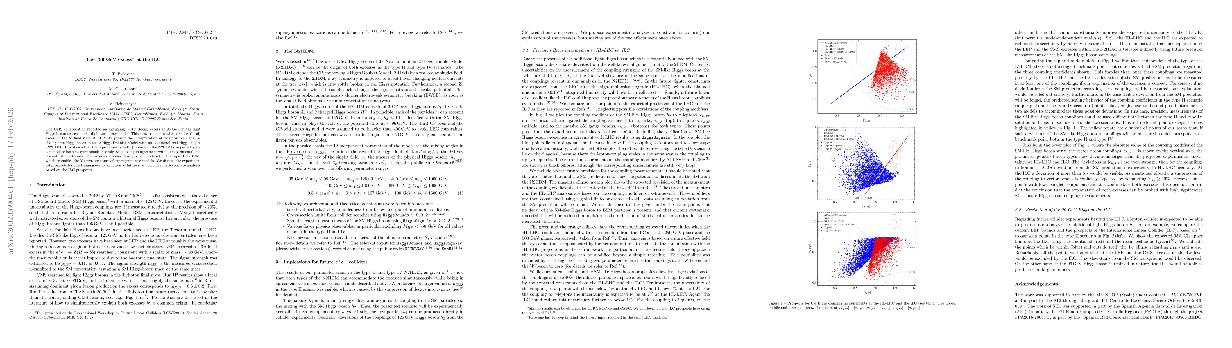 The CMS collaboration reported an intriguing \sim 3 sigma (local) excess at 96 GeV in the light Higgs-boson search in the diphoton decay mode. This mass coincides with a \sim 2 sigma (local) excess in the bb final state at LEP. We present the interpretation of this possible signal as the lightest Higgs boson in the 2 Higgs Doublet Model with an additional real Higgs singlet (N2HDM). It is shown that the type II and type IV (flipped) of the N2HDM can perfectly accommodate both excesses simultaneously, while being in agreement with all experimental and theoretical constraints. The excesses are most easily accommodated in the type II N2HDM, which resembles the Yukawa structure of supersymmetric models. We discuss the experimental prospects for constraining our explanation at future $e^+e^-$ colliders, with concrete analyses based on the ILC prospects.