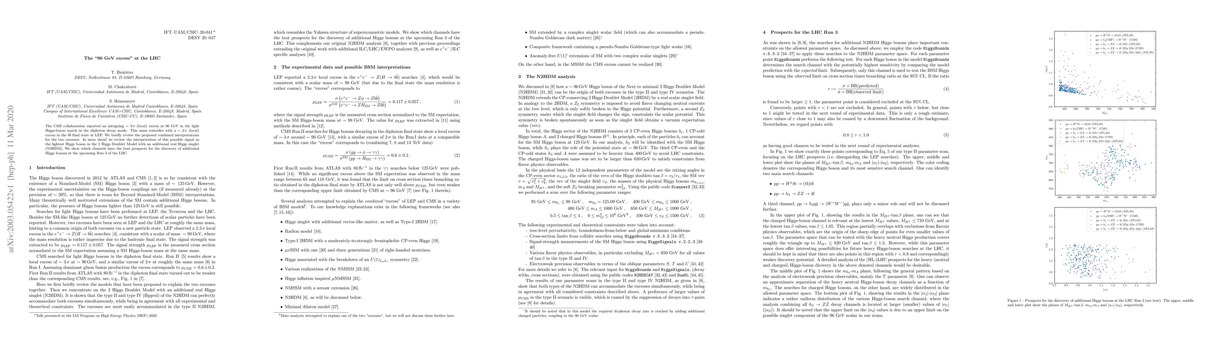 The CMS collaboration reported an intriguing \sim 3 sigma (local) excess at 96 GeV in the light Higgs-boson search in the diphoton decay mode. This mass coincides with a \sim 2 sigma (local) excess in the bb final state at LEP. We briefly review the proposed combined interpretations for the two excesses. In more detail we review the interpretation of this possible signal as the lightest Higgs boson in the 2 Higgs Doublet Model with an additional real Higgs singlet (N2HDM). We show which channels have the best prospects for the discovery of additional Higgs bosons at the upcoming Run 3 of the LHC.