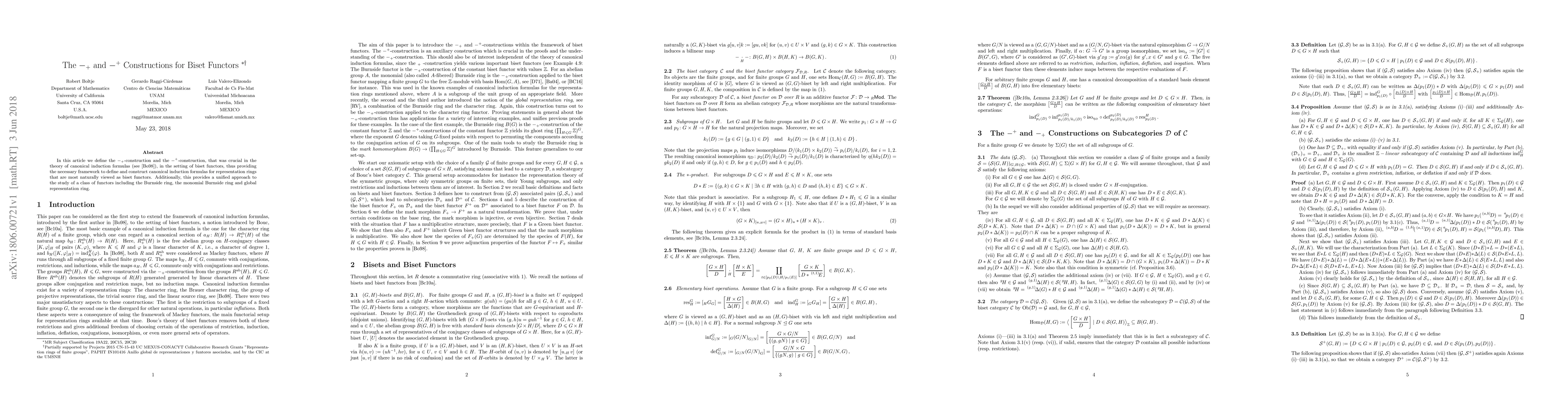 This paper introduces the $-_+$ and $-^+$ constructions for biset functors, essential for defining canonical induction formulas in representation rings viewed as biset functors. It also unifies the study of several important functors, including the Burnside ring, monomial Burnside ring, and global representation ring.
