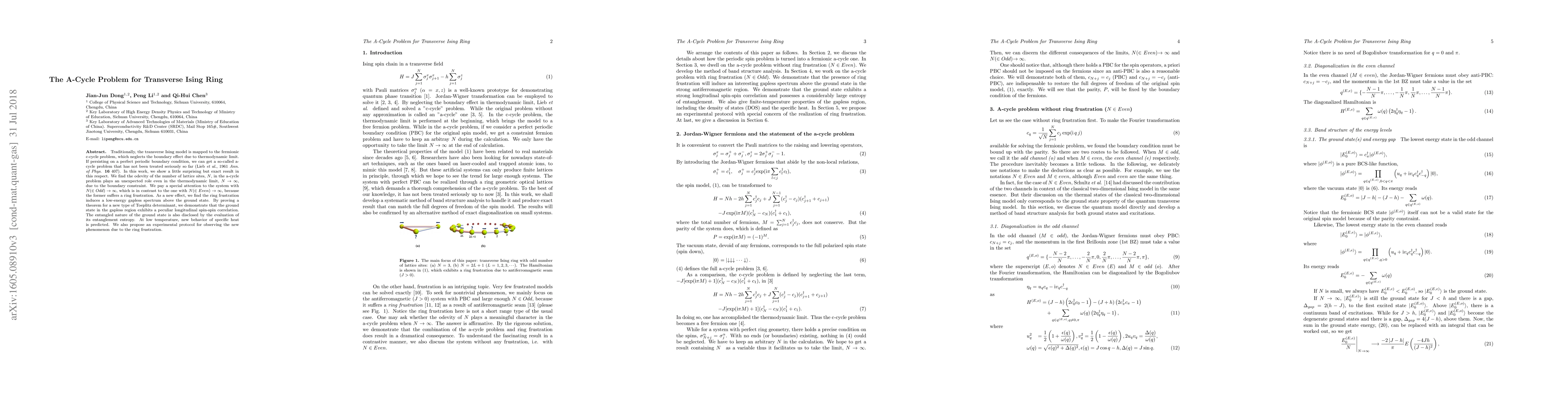 Traditionally, the transverse Ising model is mapped to the fermionic c-cycle problem, which neglects the boundary effect due to thermodynamic limit. If persisting on a perfect periodic boundary condition, we can get a so-called a-cycle problem that has not been treated seriously so far (Lieb et al., 1961 \textit{Ann. of Phys.} \textbf{16} 407). In this work, we show a little surprising but exact result in this respect. We find the odevity of the number of lattice sites, $N$, in the a-cycle problem plays an unexpected role even in the thermodynamic limit, $N\rightarrow\infty$, due to the boundary constraint. We pay a special attention to the system with $N(\in Odd)\rightarrow\infty$, which is in contrast to the one with $N(\in Even)\rightarrow\infty$, because the former suffers a ring frustration. As a new effect, we find the ring frustration induces a low-energy gapless spectrum above the ground state. By proving a theorem for a new type of Toeplitz determinant, we demonstrate that the ground state in the gapless region exhibits a peculiar longitudinal spin-spin correlation. The entangled nature of the ground state is also disclosed by the evaluation of its entanglement entropy. At low temperatures, new behavior of specific heat is predicted. We also propose an experimental protocol for observing the new phenomenon due to the ring frustration.