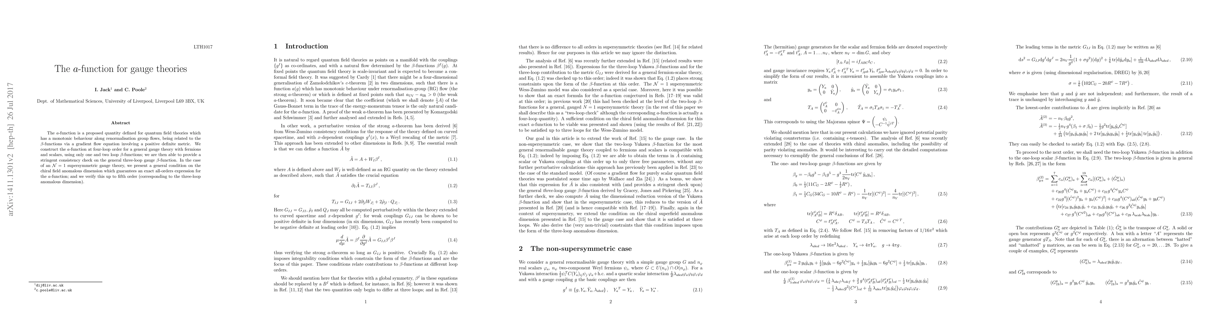 This paper constructs the a-function for gauge theories at four-loop order, using one and two-loop beta-functions, and provides a consistency check on the three-loop gauge beta-function. For N=1 supersymmetric gauge theories, it establishes a condition ensuring an exact all-orders expression for the a-function, verified up to fifth order.