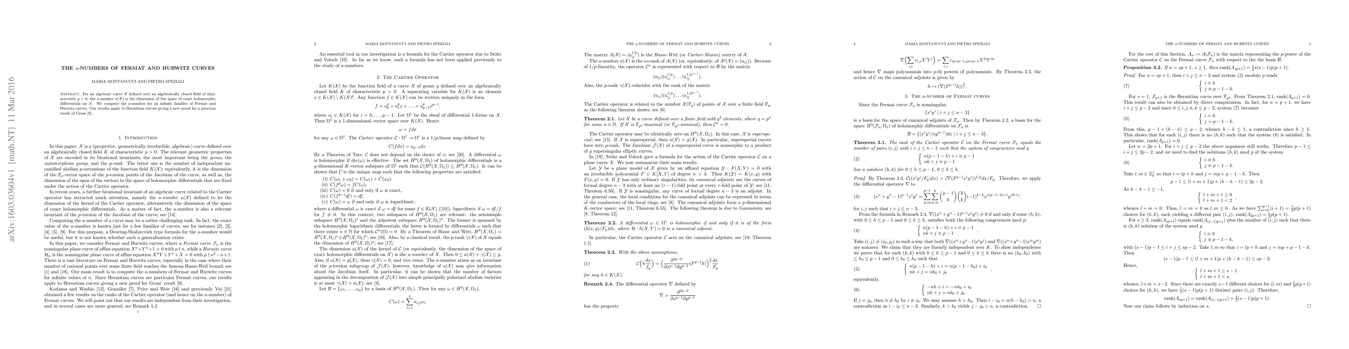 For an algebraic curve $\mathcal{X}$ defined over an algebraically closed field of characteristic $p >0$, the $a$-number $a(\mathcal{X})$ is the dimension of the space of exact holomorphic differentials on $\mathcal{X}$. We compute the $a$-number for an infinite families of Fermat and Hurwitz curves. Our results apply to Hermitian curves giving a new proof for a previous result of Gross.