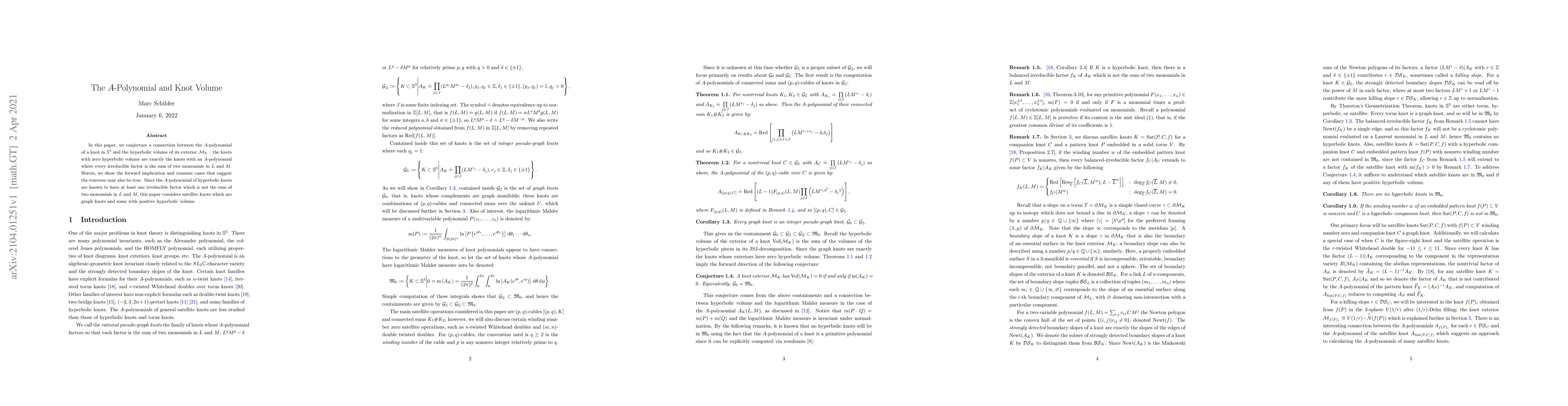 In this paper, we conjecture a connection between the $A$-polynomial of a knot in $\mathbb{S}^{3}$ and the hyperbolic volume of its exterior $\mathcal{M}_{K}$ : the knots with zero hyperbolic volume are exactly the knots with an $A$-polynomial where every irreducible factor is the sum of two monomials in $L$ and $M$. Herein, we show the forward implication and examine cases that suggest the converse may also be true. Since the $A$-polynomial of hyperbolic knots are known to have at least one irreducible factor which is not the sum of two monomials in $L$ and $M$, this paper considers satellite knots which are graph knots and some with positive hyperbolic volume.
