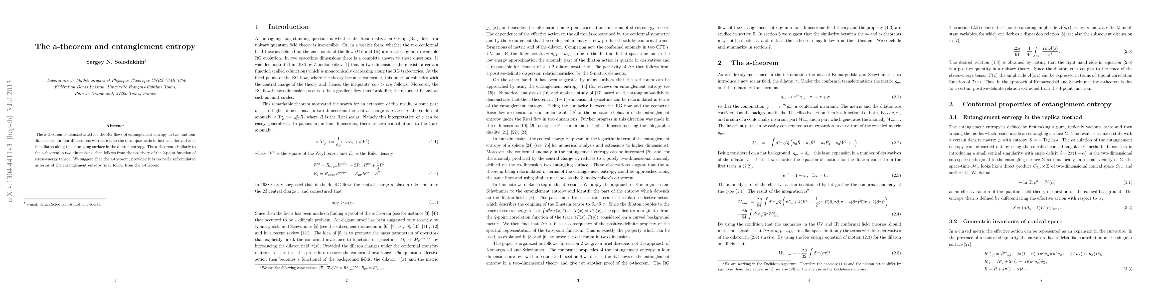 The paper demonstrates the a-theorem for renormalization group (RG) flows in entanglement entropy in two and four dimensions, linking it to the dilaton entropy in four dimensions and suggesting a connection to the c-theorem in two dimensions. The a-theorem may follow from the c-theorem when reformulated in terms of entanglement entropy.