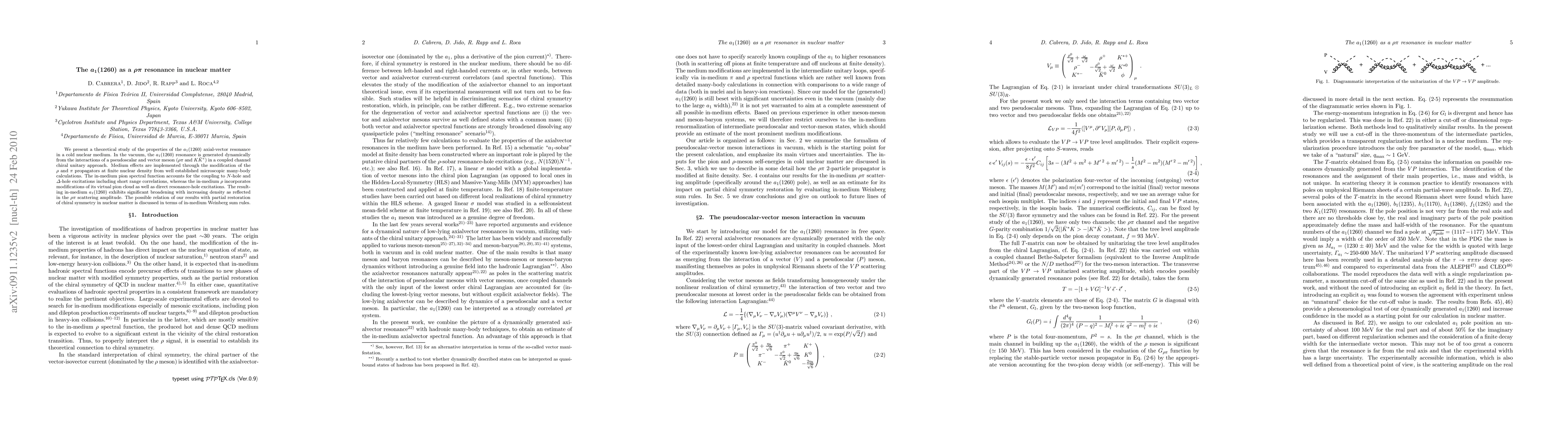 This paper investigates the a1(1260) axial-vector resonance in cold nuclear matter, showing significant broadening due to modifications in rho and pi propagators. The study discusses the resonance's relation to partial restoration of chiral symmetry through in-medium Weinberg sum rules.