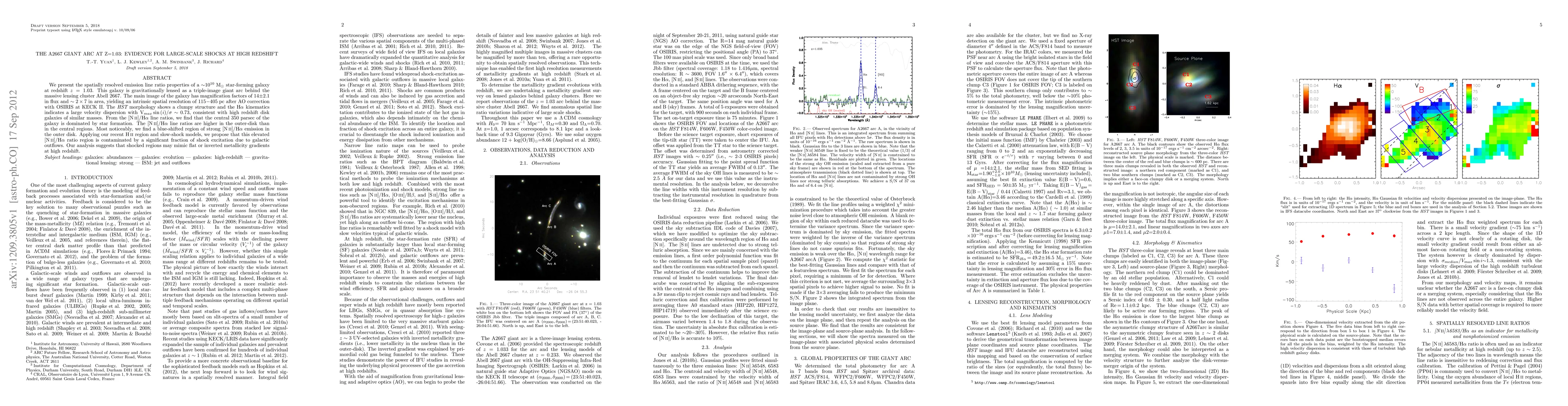 We present the spatially resolved emission line ratio properties of a ~10^10 M_sun star-forming galaxy at redshift z=1.03. This galaxy is gravitationally lensed as a triple-image giant arc behind the massive lensing cluster Abell 2667. The main image of the galaxy has magnification factors of 14+/-2.1 in flux and ~ 2 by 7 in area, yielding an intrinsic spatial resolution of 115-405 pc after AO correction with OSIRIS at KECK II. The HST morphology shows a clumpy structure and the H\alpha\ kinematics indicates a large velocity dispersion with V_{max} sin(i)/\sigma ~ 0.73, consistent with high redshift disk galaxies of similar masses. From the [NII]/H\alpha\ line ratios, we find that the central 350 parsec of the galaxy is dominated by star formation. The [NII]/H\alpha\ line ratios are higher in the outer-disk than in the central regions. Most noticeably, we find a blue-shifted region of strong [NII]/H\alpha\ emission in the outer disk. Applying our recent HII region and slow-shock models, we propose that this elevated [NII]/H\alpha\ ratio region is contaminated by a significant fraction of shock excitation due to galactic outflows. Our analysis suggests that shocked regions may mimic flat or inverted metallicity gradients at high redshift.