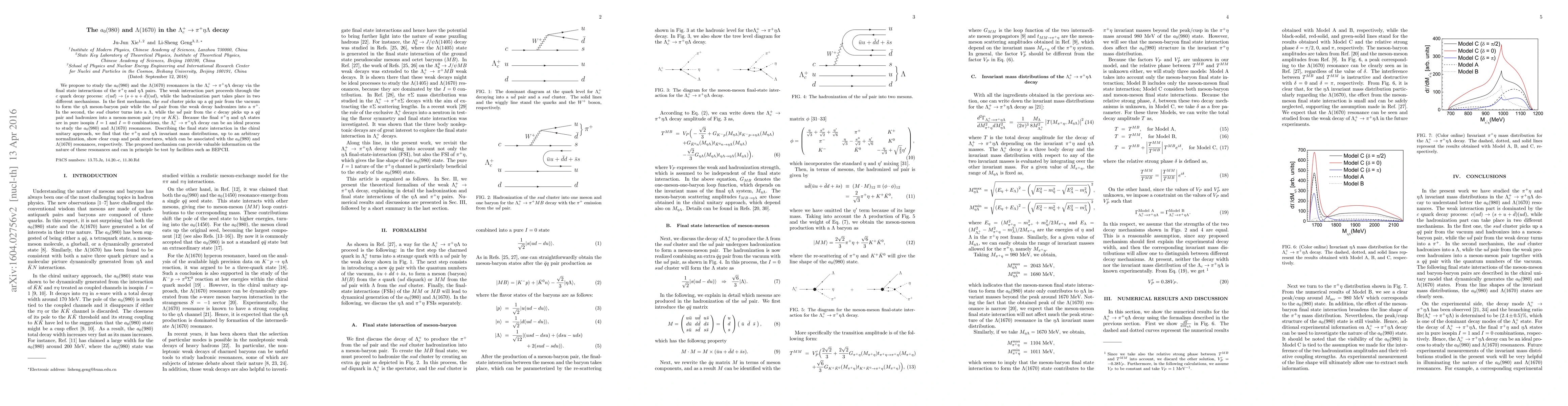 This paper investigates the $a_0(980)$ and $\Lambda(1670)$ resonances in the $\Lambda^+_c \to \pi^+ \eta \Lambda$ decay, proposing that final state interactions of $\pi^+ \eta$ and $\eta \Lambda$ pairs reveal these resonances. The study uses the chiral unitary approach to describe the decay, finding distinct cusp and peak structures in the invariant mass distributions that correspond to the $a_0(980)$ and $\Lambda(1670)$ resonances.