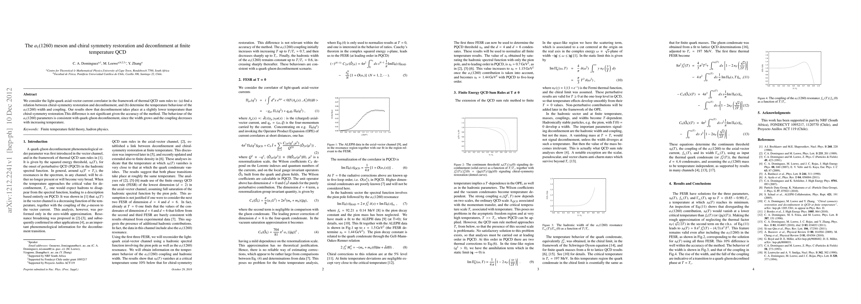 We consider the light-quark axial-vector current correlator in the framework of thermal QCD sum rules to: (a) find a relation between chiral-symmetry restoration and deconfinement, and (b) determine the temperature behaviour of the $a_1(1260)$ width and coupling. Our results show that deconfinement takes place at a slightly lower temperature than chiral-symmetry restoration.This difference is not significant given the accuracy of the method. The behaviour of the $a_1(1260)$ parameters is consistent with quark-gluon deconfinement, since the width grows and the coupling decreases with increasing temperature.