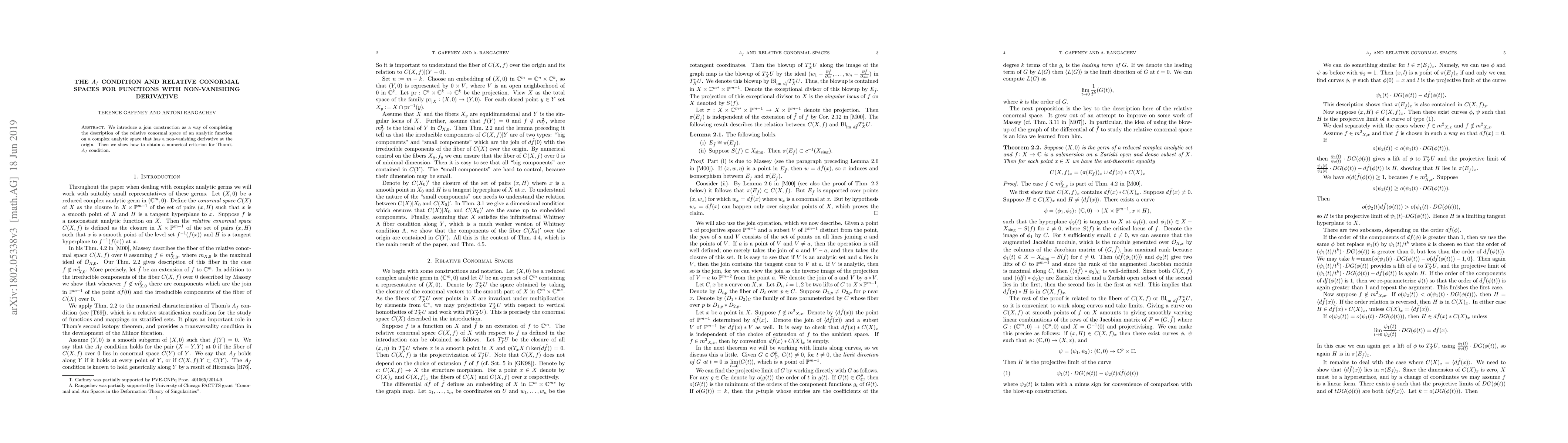 We introduce a join construction as a way of completing the description of the relative conormal space of an analytic function on a complex analytic space that has a non-vanishing derivative at the origin. Then we show how to obtain a numerical criterion for Thom's A_f condition.