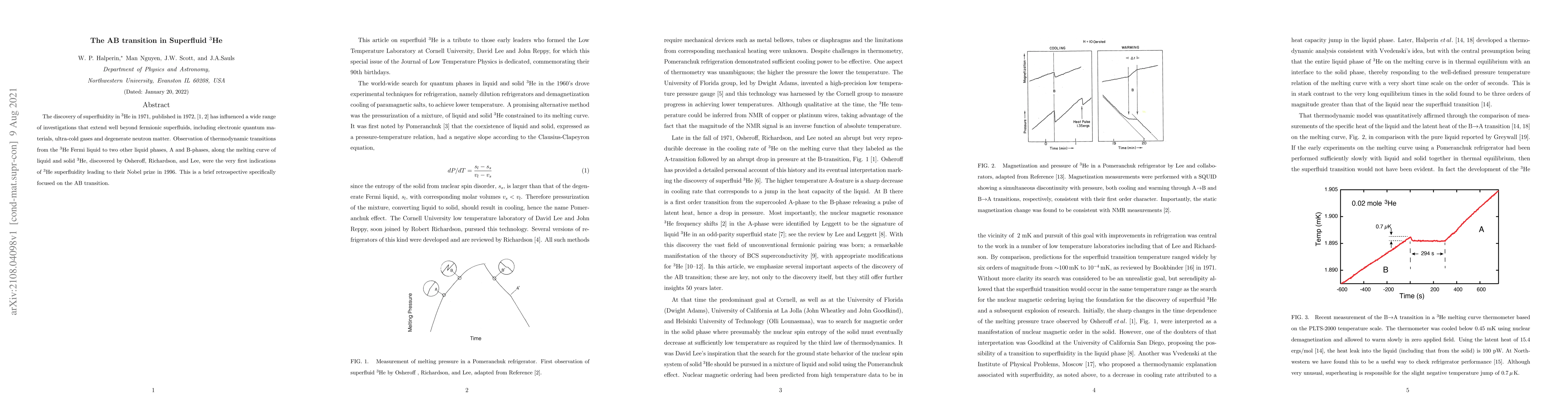 The discovery of superfluidity in 3He in 1971, published in 1972, [1, 2] has influenced a wide range of investigations that extend well beyond fermionic superfluids, including electronic quantum ma- terials, ultra-cold gases and degenerate neutron matter. Observation of thermodynamic transitions from the 3He Fermi liquid to two other liquid phases, A and B-phases, along the melting curve of liquid and solid 3He, discovered by Osheroff, Richardson, and Lee, were the very first indications of 3He superfluidity leading to their Nobel prize in 1996. This is a brief retrospective specifically focused on the AB transition.