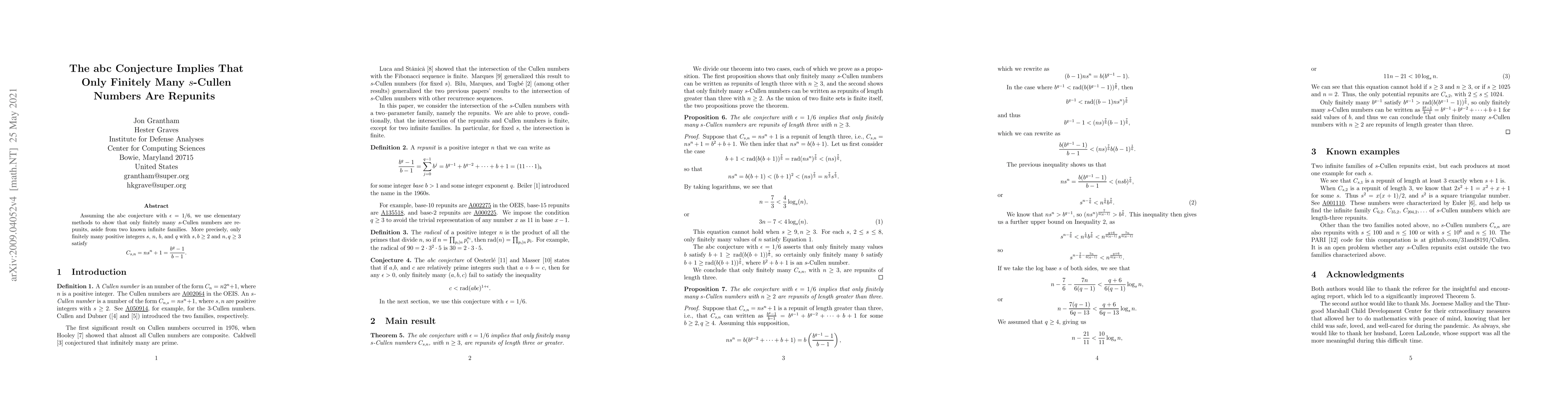 Assuming the abc conjecture with $\epsilon=1/6$, we use elementary methods to show that only finitely many $s$-Cullen numbers are repunits, aside from two known infinite families. More precisely, only finitely many positive integers $s$, $n$, $b$, and $q$ with $s,b \geq 2$ and $n,q \geq 3$ satisfy \[C_{s,n} = ns^n + 1 = \frac{b^q -1}{b-1}.\]