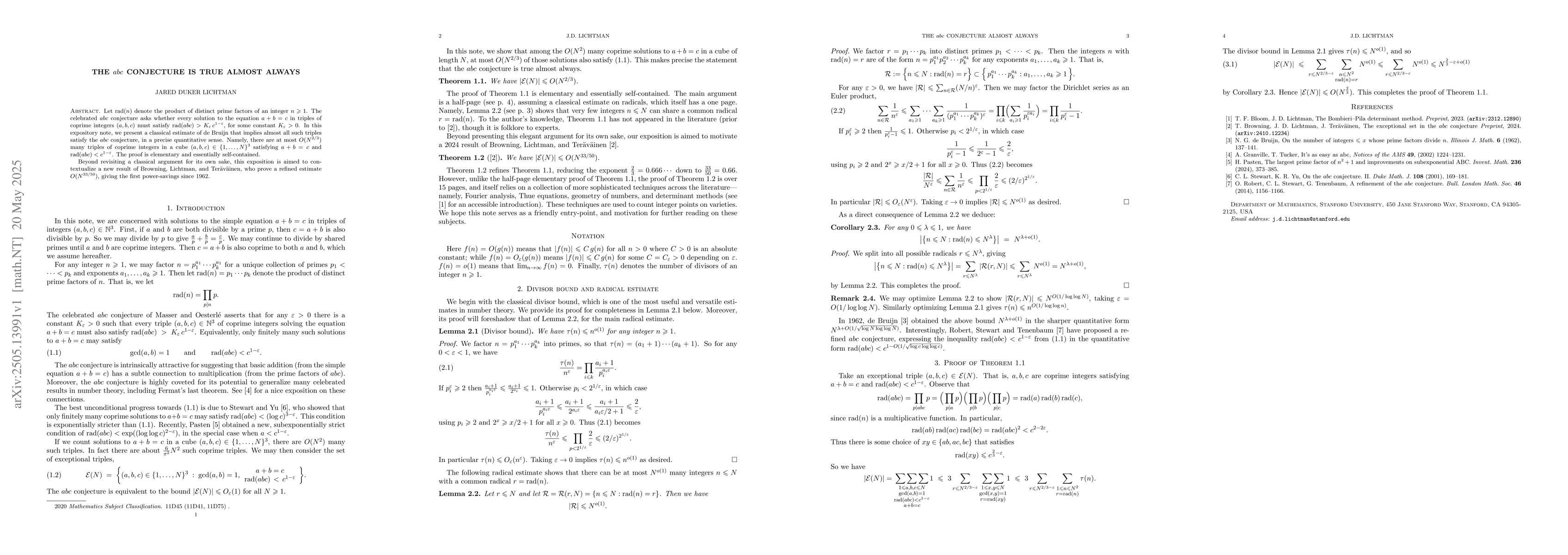 The paper's main contribution is the classical de Bruijn's estimate and its application to demonstrate that almost all coprime triples satisfy the $abc$ conjecture, alongside contextualizing and improving upon this with Browning, Lichtman, and Teräväinen's result.