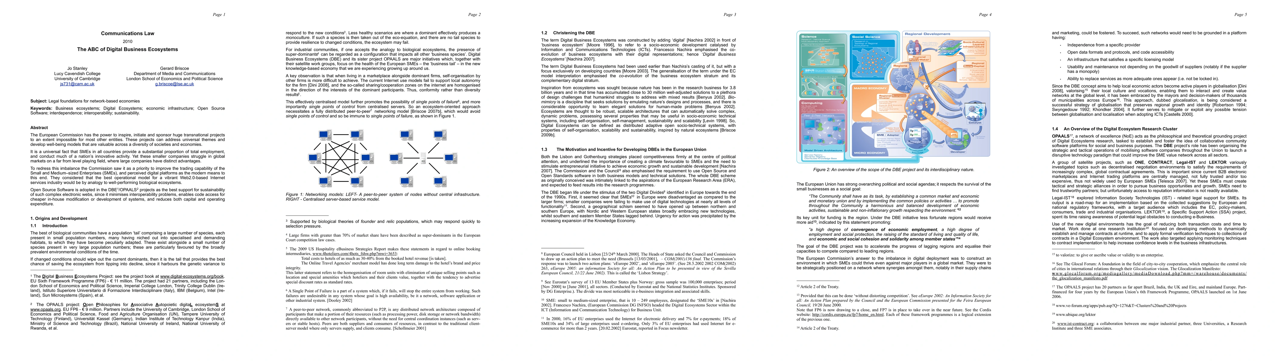 The European Commission has the power to inspire, initiate and sponsor huge transnational projects to an extent impossible for most other entities. These projects can address universal themes and develop well-being models that are valuable across a diversity of societies and economies. It is a universal fact that SMEs in all countries provide a substantial proportion of total employment, and conduct much of a nation's innovative activity. Yet these smaller companies struggle in global markets on a far from level playing field, where large companies have distinct advantages. To redress this imbalance the Commission saw it as a priority to improve the trading capability of the Small and Medium-sized Enterprises (SMEs), and perceived digital platforms as the modern means to this end. They considered that the best operational model for a vibrant Web2.0-based Internet services industry would be by analogy to well-performing biological ecosystems. Open Source Software is adopted in the DBE/OPAALS projects as the best support for sustainability of such complex electronic webs, since it minimises interoperability problems, enables code access for cheaper in-house modification or development of systems, and reduces both capital and operating expenditure.